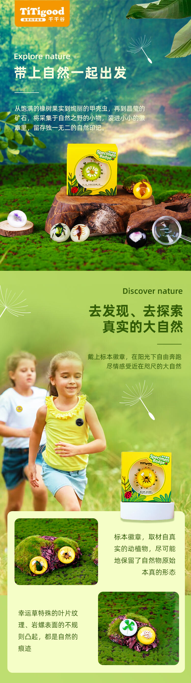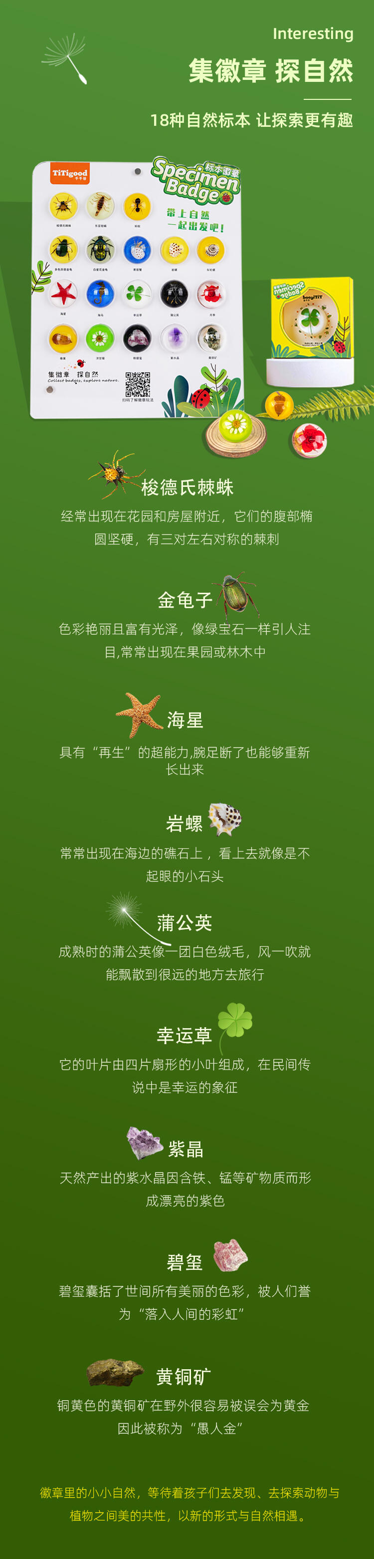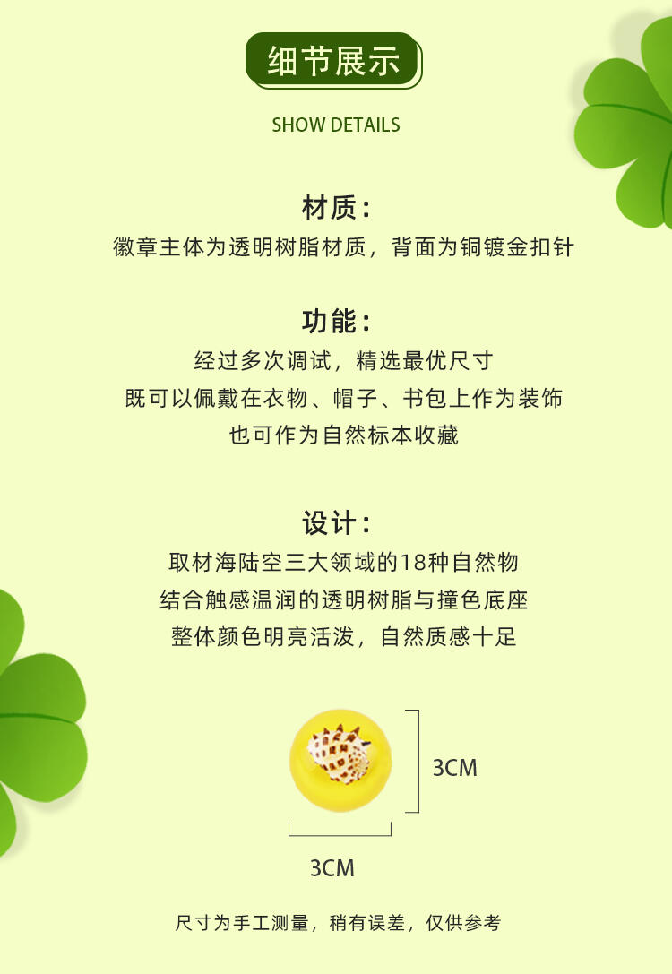 我们倡导“寓学于乐 玩中启蒙”的教育理念,选用来自大自然的真实动植物标本,配套通俗易懂的科普知识,引领孩子在观察与探索中,打开自然科学知识的大门。产品选用真实动植物标本,呈现生物自然原始的形态,给孩子真实的探索体验;使用安全无毒高透明树脂材质可清晰地观察到生物的每一个形态细节;每一个晶体都经过细致的手工打磨边角光滑,手感温润,可长久保存。可佩戴装饰,可扫码查看物种科普