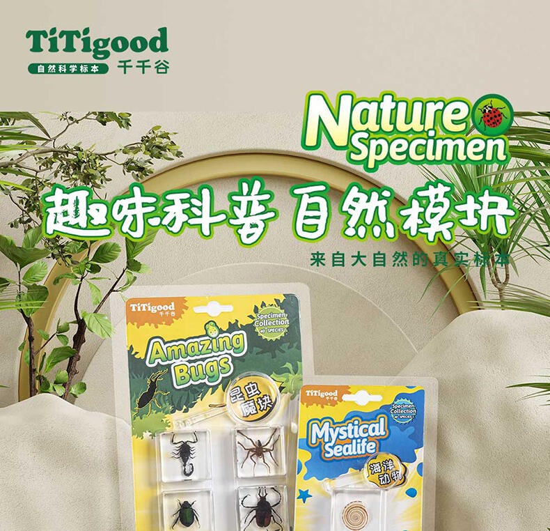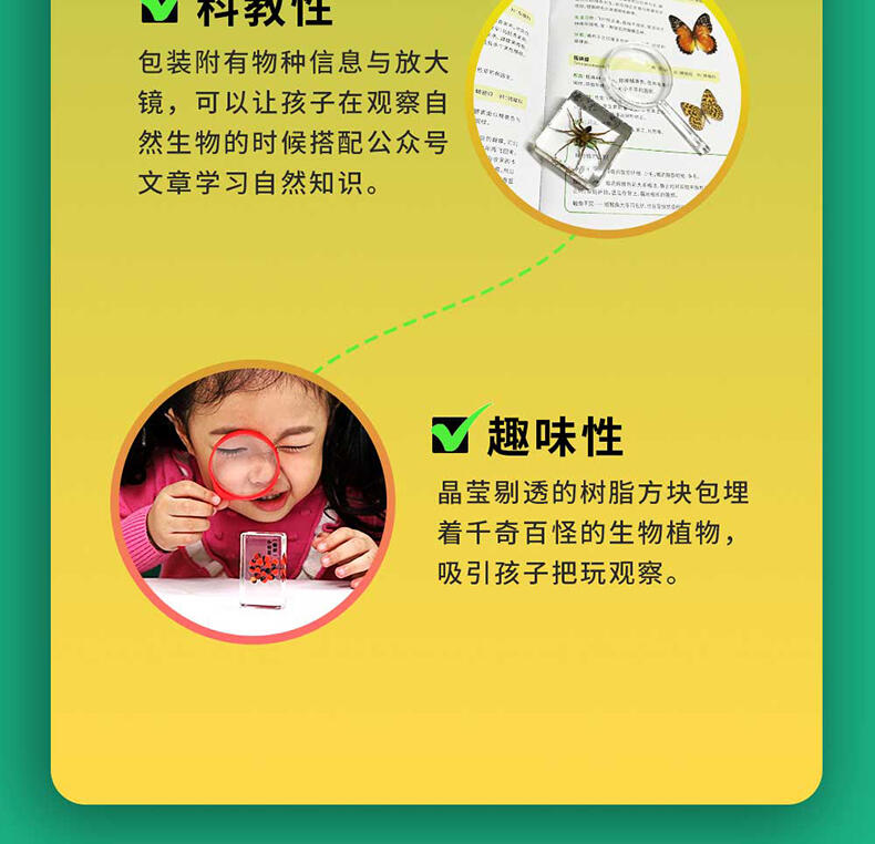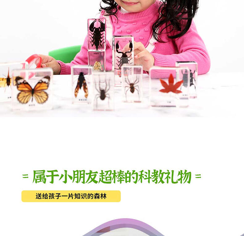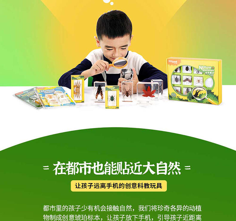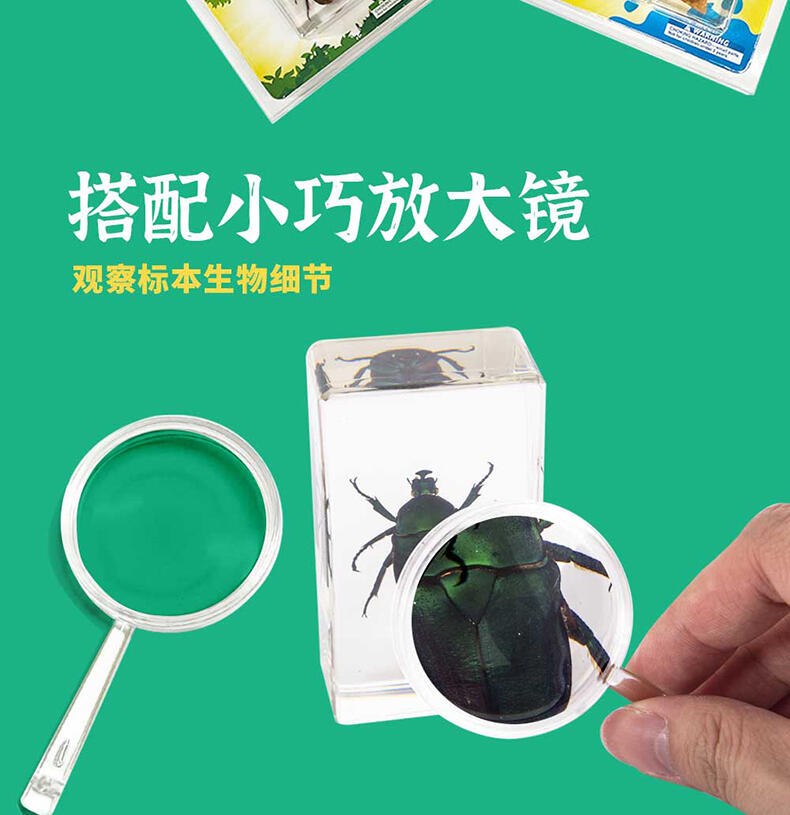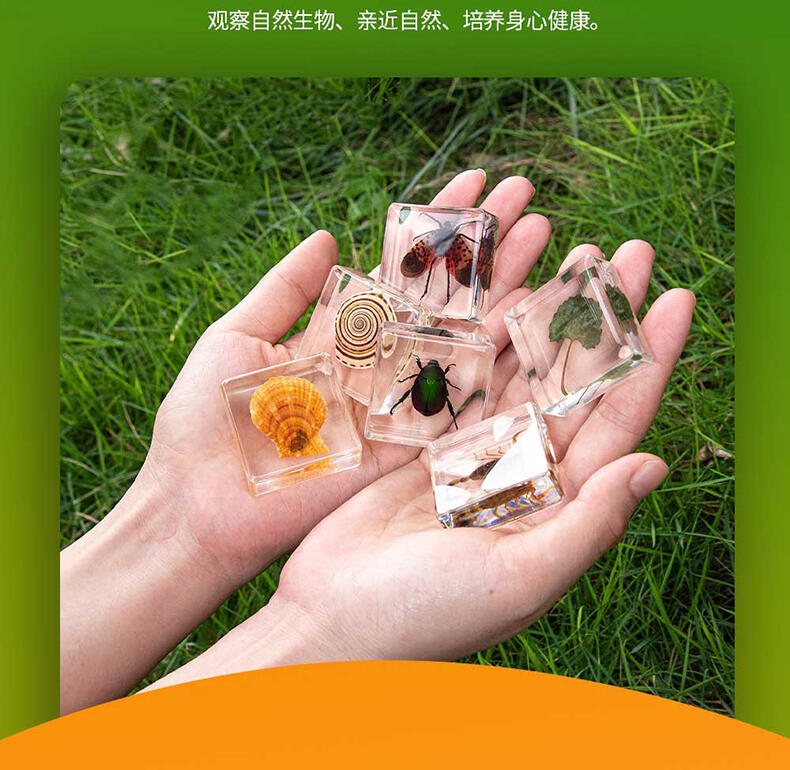 我们倡导“寓学于乐 玩中启蒙”的教育理念,选用来自大自然的真实动植物标本,配套通俗易懂的科普知识,引领孩子在观察与探索中,打开自然科学知识的大门。产品选用真实动植物标本,呈现生物自然原始的形态,给孩子真实的探索体验;使用安全无毒高透明树脂材质可清晰地观察到生物的每一个形态细节;每一个晶体都经过细致的手工打磨边角光滑,手感温润,可长久保存。