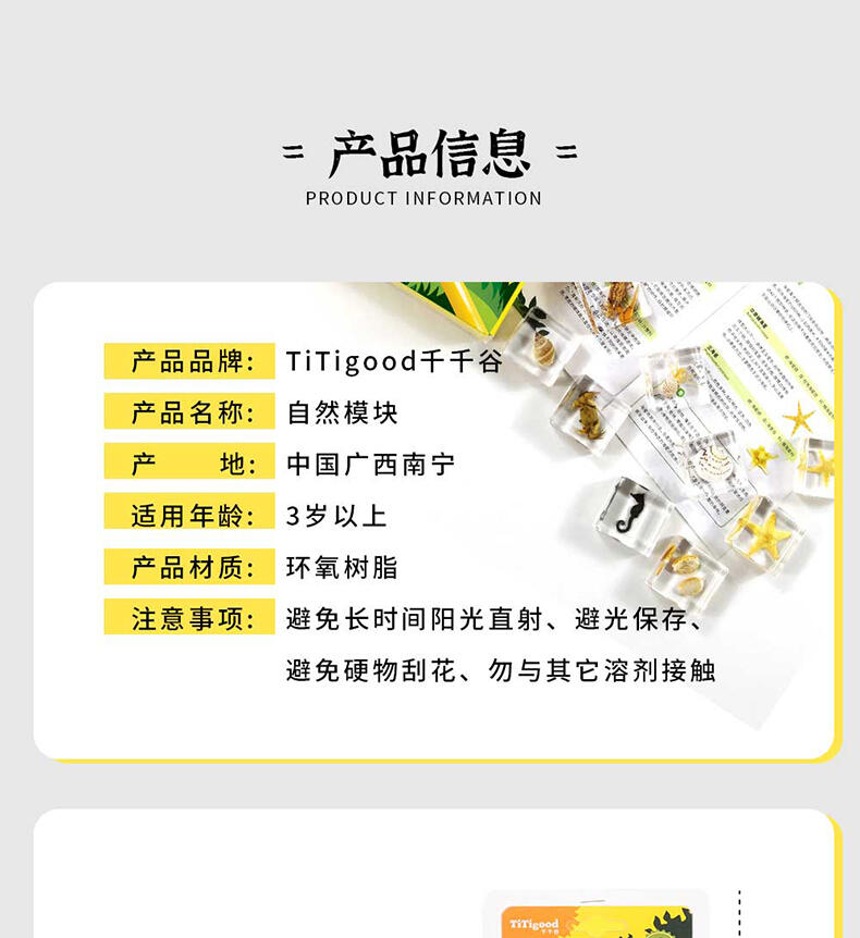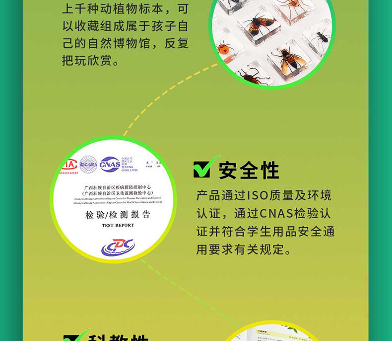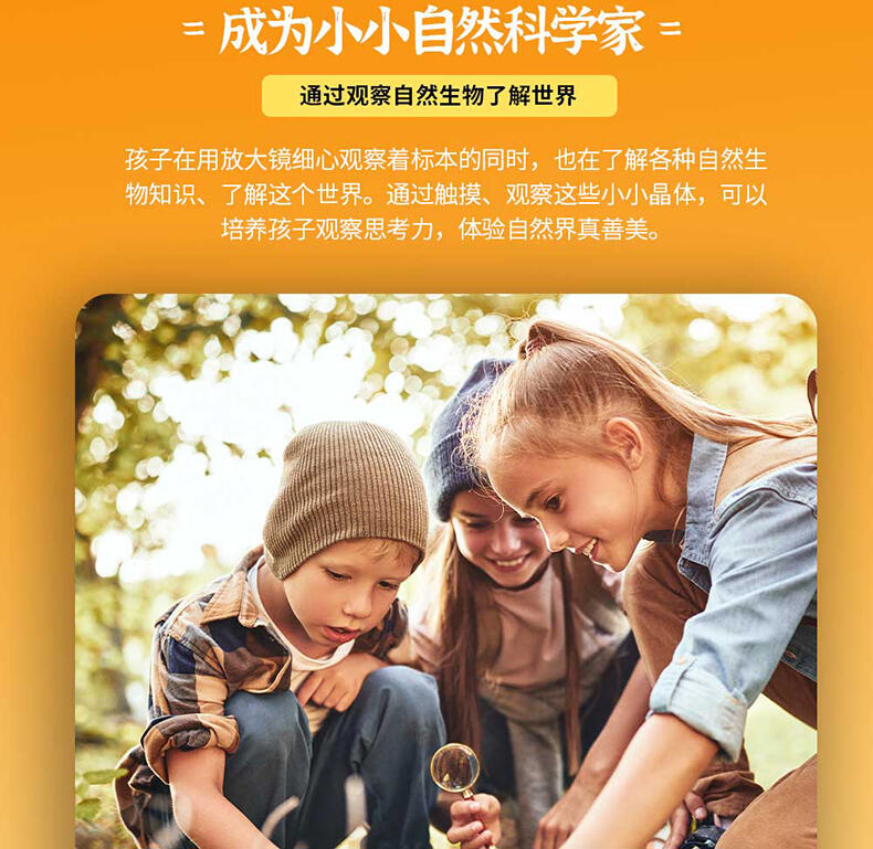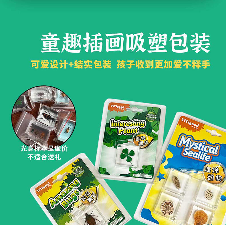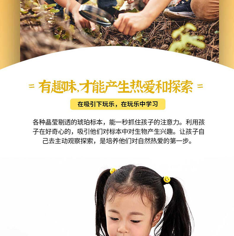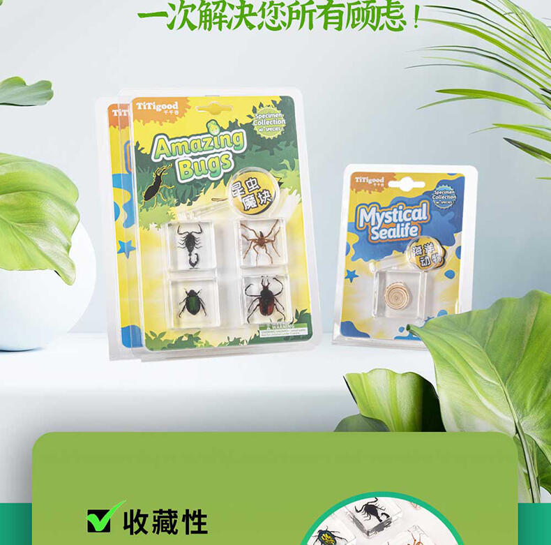 我们倡导“寓学于乐 玩中启蒙”的教育理念,选用来自大自然的真实动植物标本,配套通俗易懂的科普知识,引领孩子在观察与探索中,打开自然科学知识的大门。产品选用真实动植物标本,呈现生物自然原始的形态,给孩子真实的探索体验;使用安全无毒高透明树脂材质可清晰地观察到生物的每一个形态细节;每一个晶体都经过细致的手工打磨边角光滑,手感温润,可长久保存。