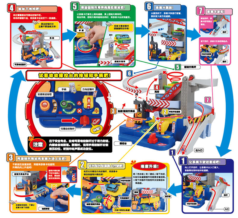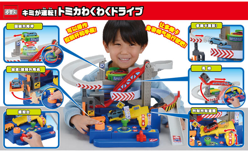 套组设有4处动作操作(控制杆及手柄),以及1处跳跃板,小朋友可模拟自行操作驾驶公路的乐趣。另,套组内附赠丰田海力士Tomica多美卡1辆,快来试试控制操作吧!