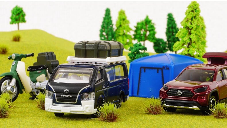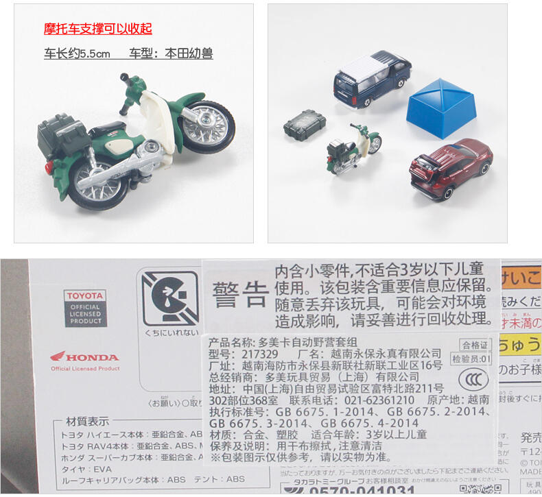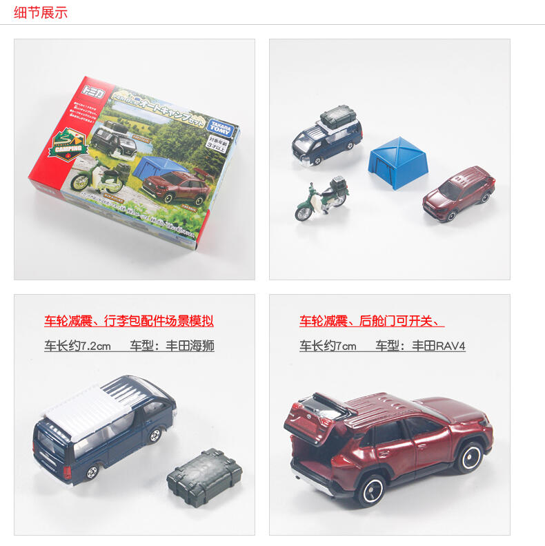 多美卡自动野营套组,3辆小车+一个帐篷,丰田海狮(车轮减震、行李包配件场景模拟)、丰田RAV4(车轮减震、后舱门可开关)、本田幼兽摩托车(摩托车支撑可以收起),套组可动性,可玩性高,沉浸式体验野营的乐趣。