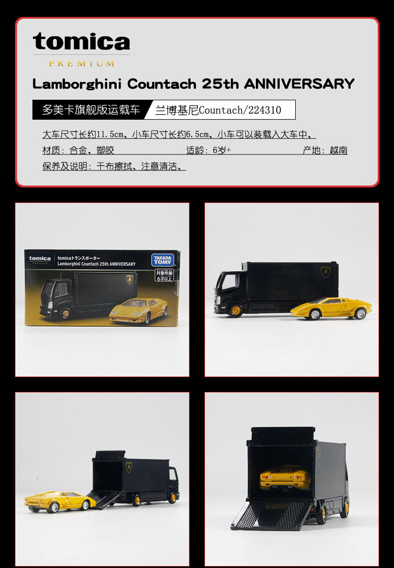 多美卡旗舰版运载车系列,兰博基尼Countach,大车尺寸长约11.5cm、小车尺寸长约6.5cm、小车可以装载在大车上,搭配玩耍。