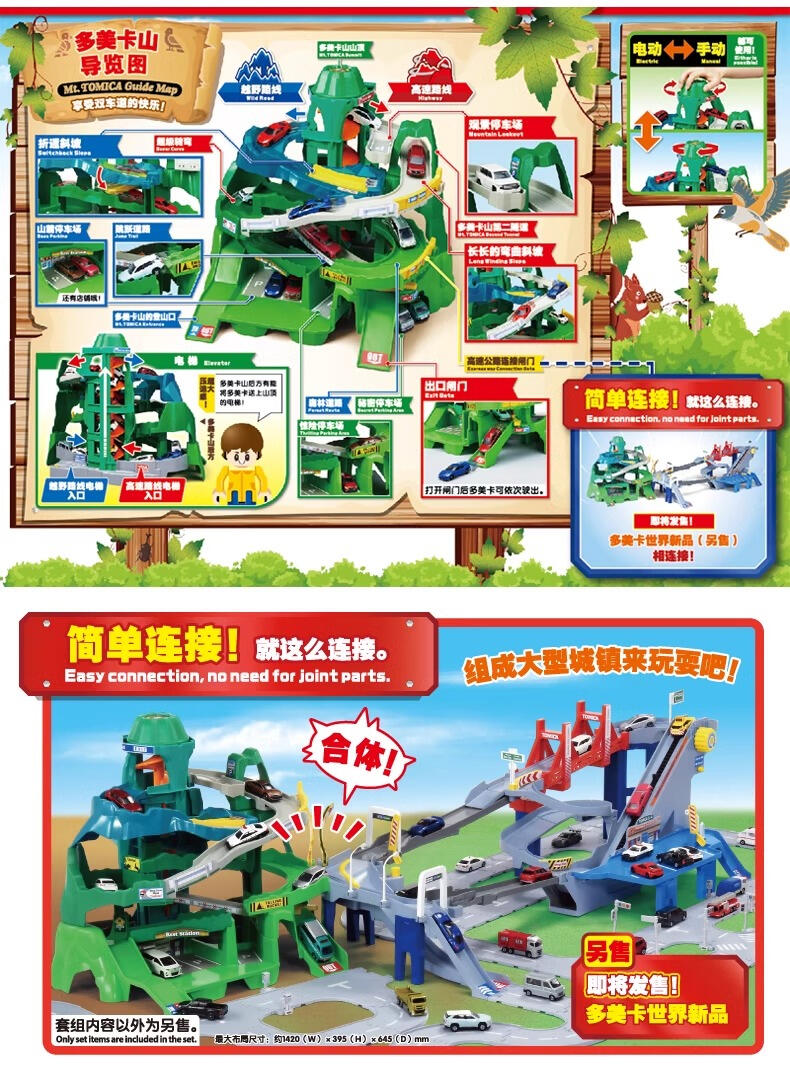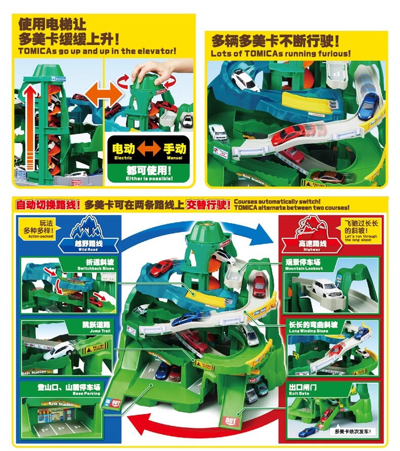 托米卡登上双电梯,在两条山路上来回跑。2条路线是像8个字一样连接起来的长路线,可以跑很多托米卡玩。【狂野路线】的跳跃台和开关后坡等动作满分!【高速公路路线】有长弯弯曲曲的坡道,托米卡可以穿过长路线。山脚下的停车场和三叶草台等停车场也很丰富。电梯可以切换电动、手动,不用电池也可以玩。组装简单!因为零件不容易散开整理也简单!如果与另卖的「2WAY热闹高速道路(2024年秋天发售预定)」连接大的兜风路线完成!※套餐内容以外的迷你车是分开卖的。