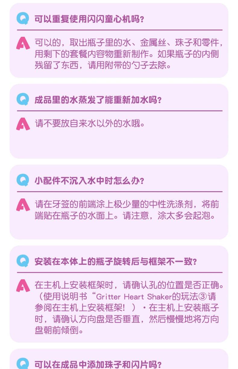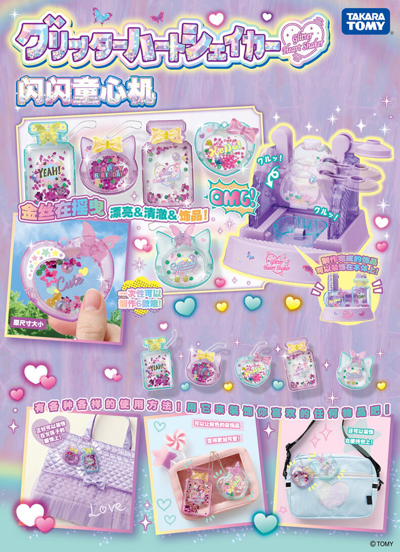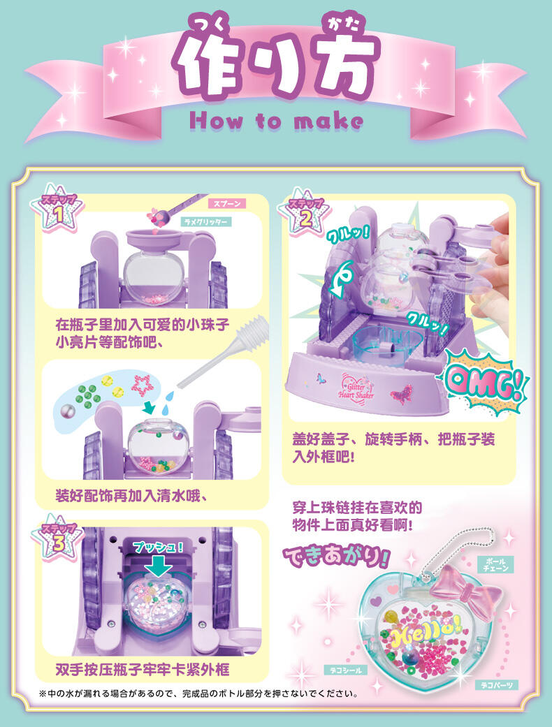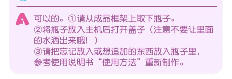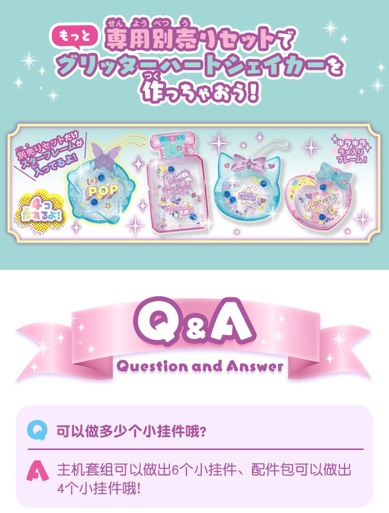 闪闪童心机,附带各种亮晶晶小珠子、小亮片等配饰,以及不同形状的小瓶子,只需要加入清水及配饰到瓶子中,便能制作出专属自己的挂件装饰自己喜欢的物品!制作完成的饰品还能装饰在本体机子上