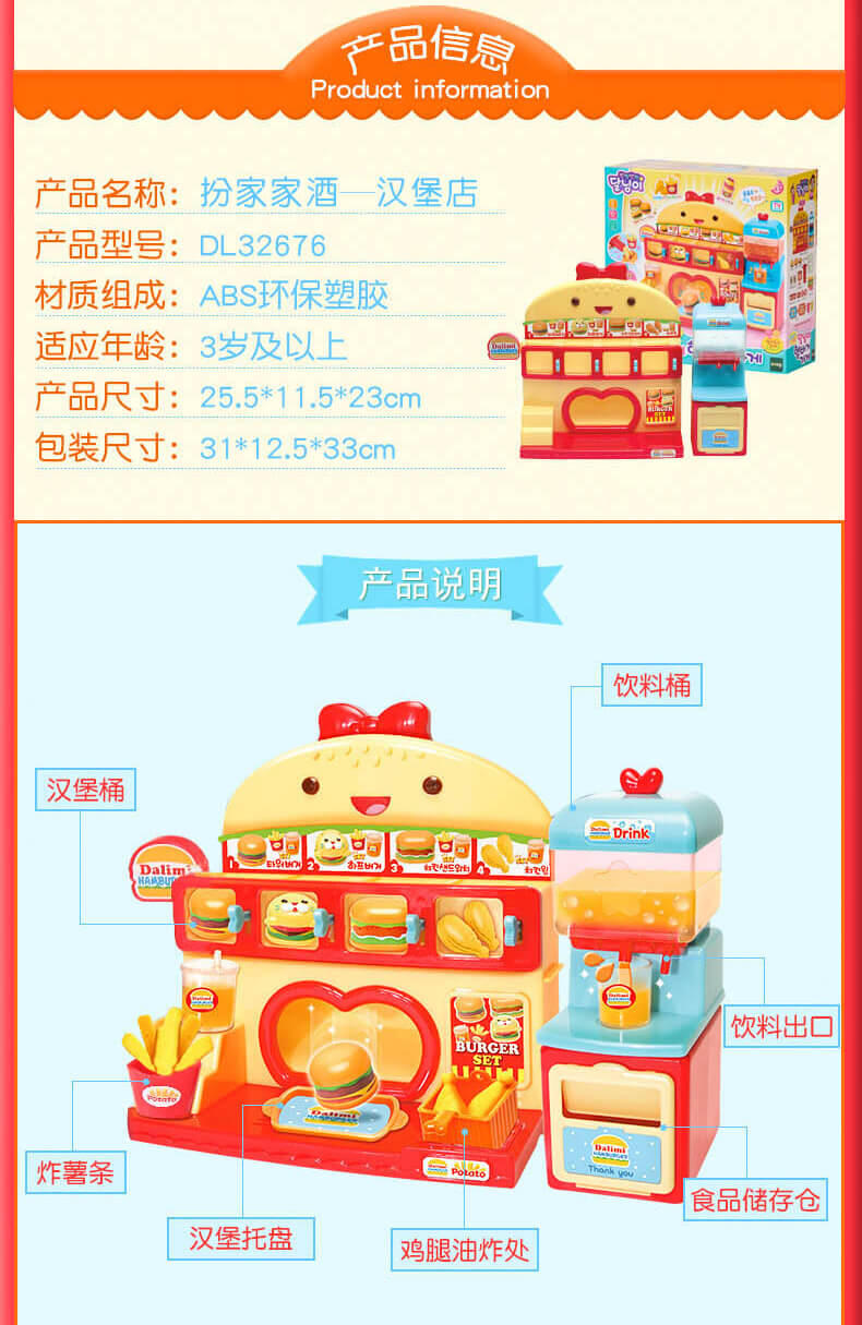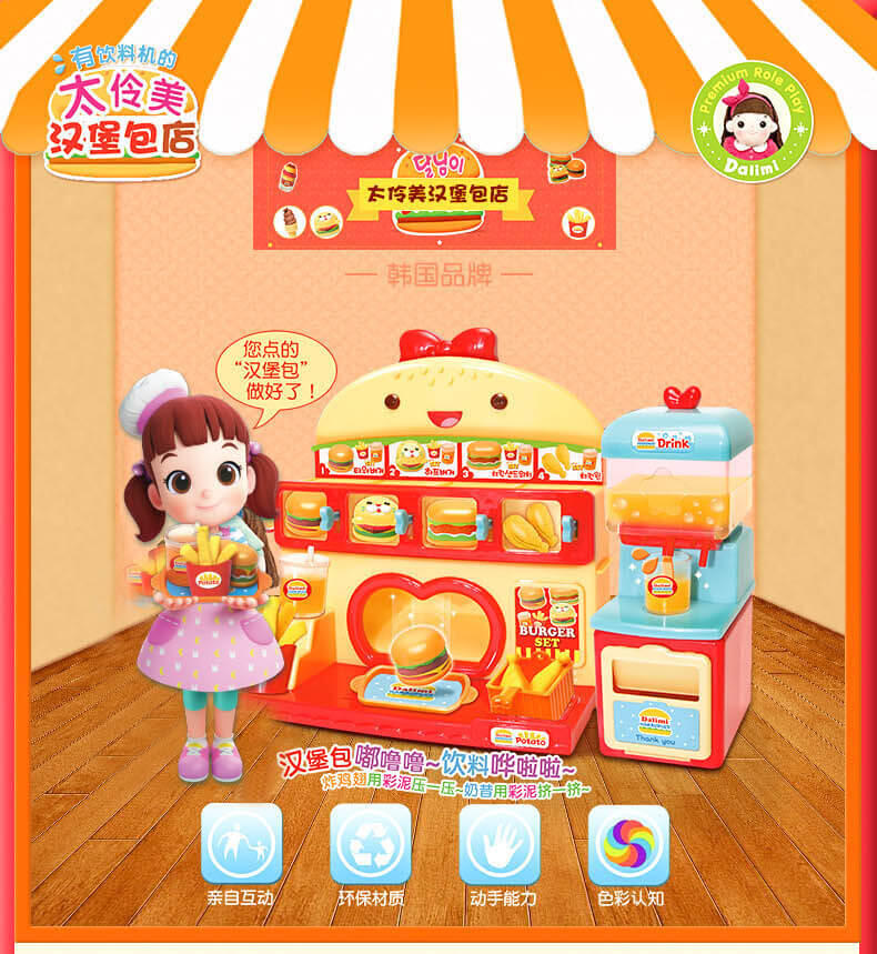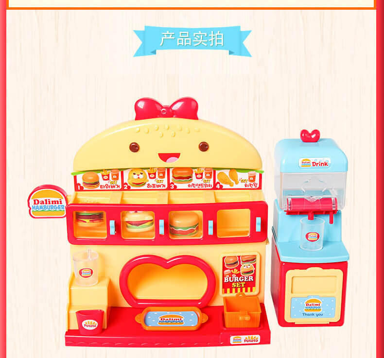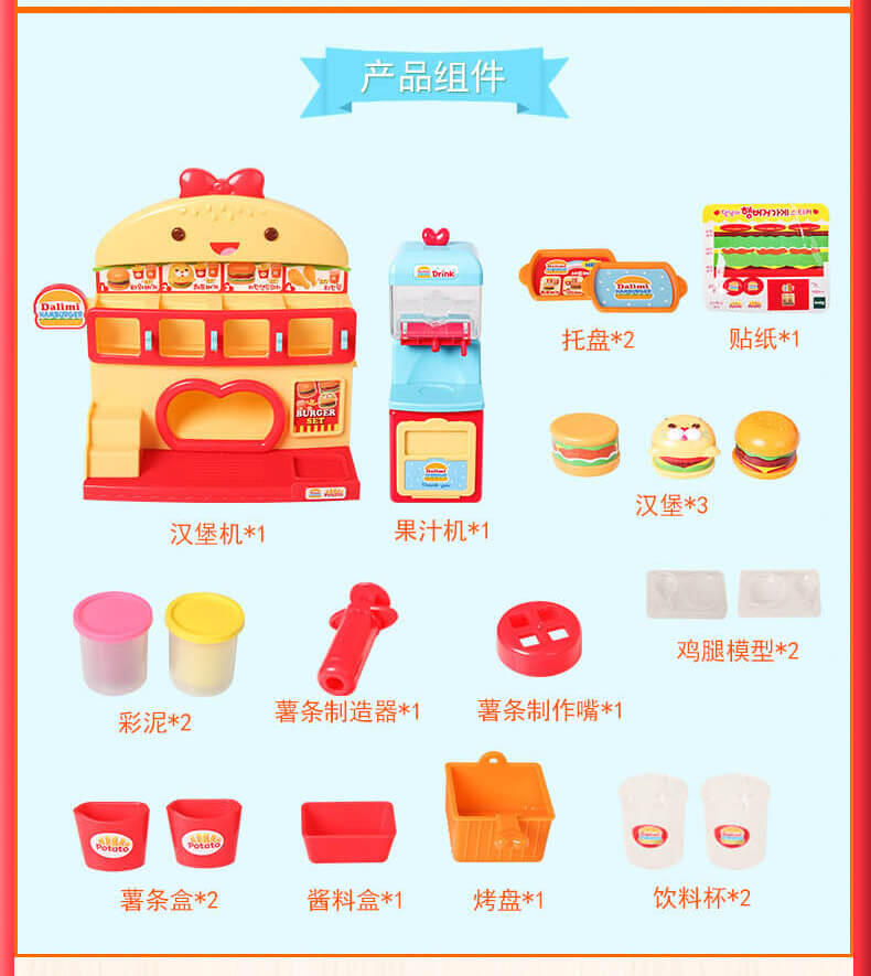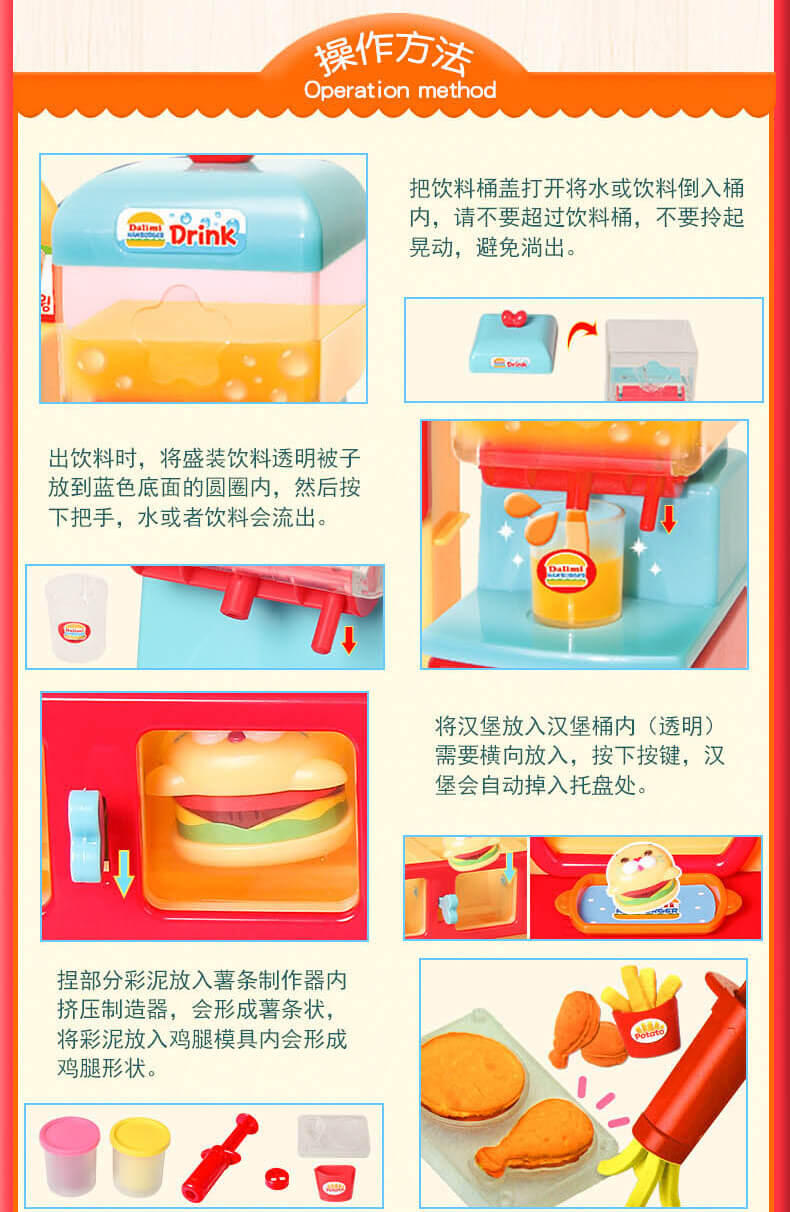Dalimi开店啰~这次开的是汉堡包店!利用模具将泥胶做成薯条和鸡块的形状,今天想食几号餐呢?食汉堡包当然不能无饮料!真的可以装水的饮料机,今天想饮什么呢?食完了餐别忘了把垃圾丢到饮料机下面的垃圾桶哦!谢谢光临!