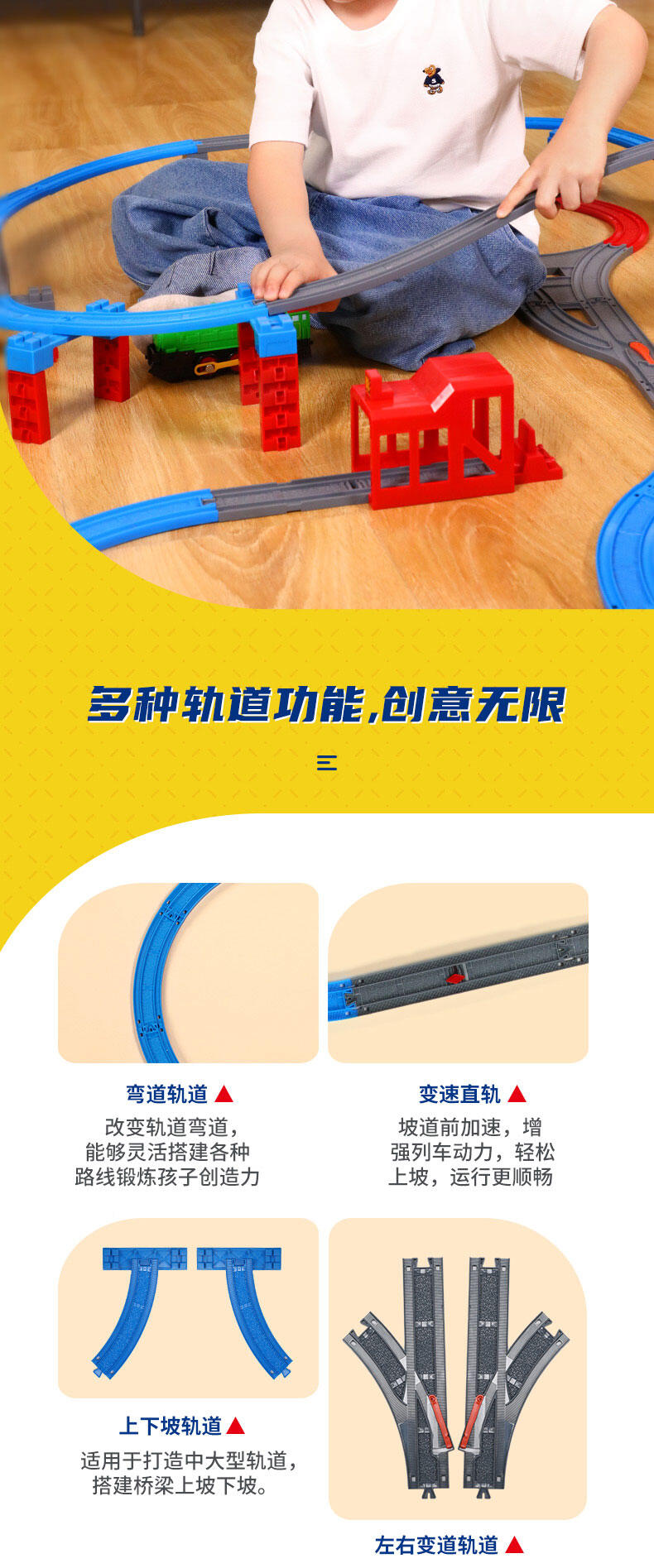 打开开关,玩具车会向前移动.轨道可拼接,配件丰富。