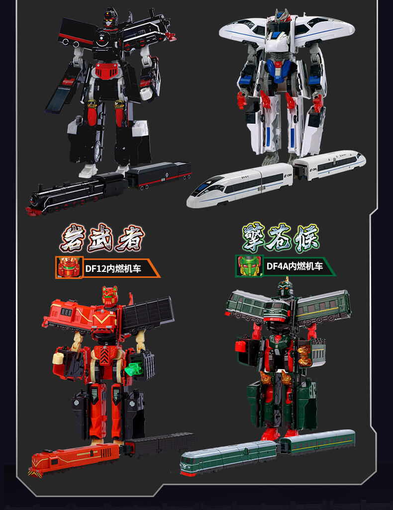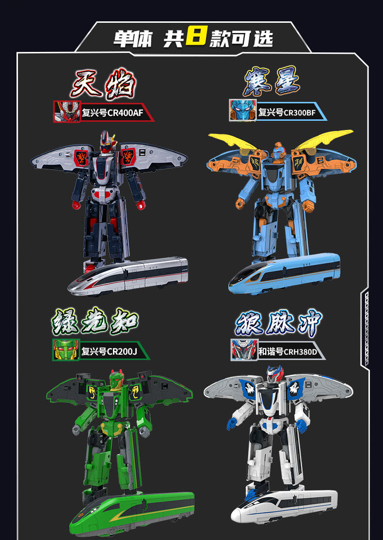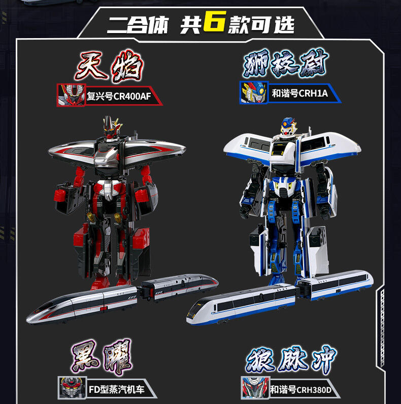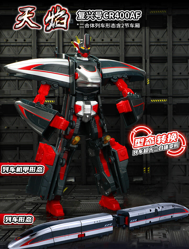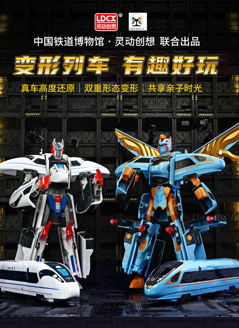 | 中国铁道博物馆官方监制,携手打造代表中国高铁文化的“国民玩具”! 两种形态,自由切换:列车形态高度还原真实列车造型、机甲形态帅气炫酷! 两种玩法,趣味十足:列车玩法模拟列车行驶,畅快滑行、机甲玩法手动变形,多处关节可动。 |
