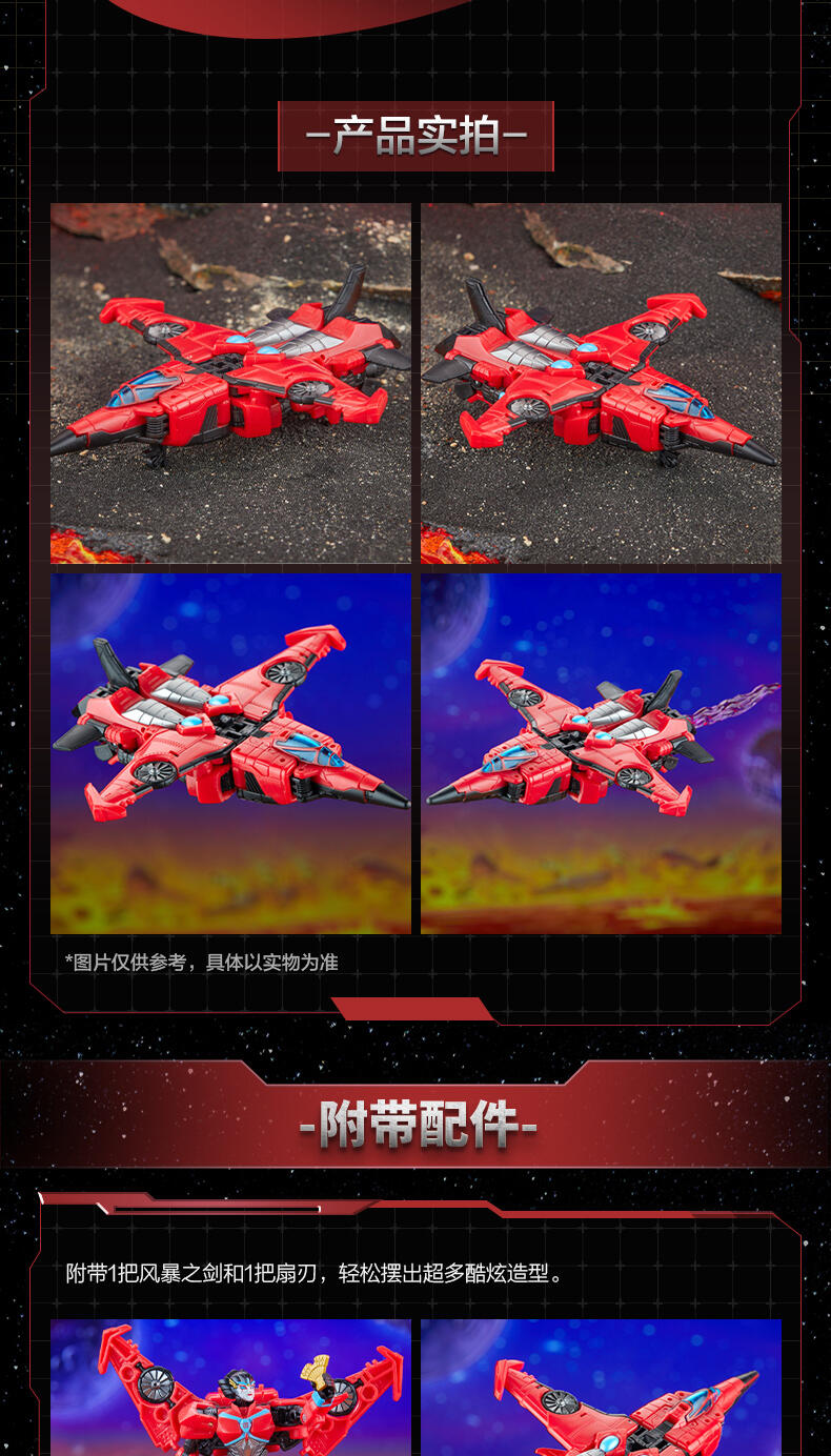 - 精致配件: 这款塞伯坦宇宙风刃变形金刚动作模型配有风暴之刃 (Stormfall Sword) 和扇叶配件。两种模式下均可连接配件