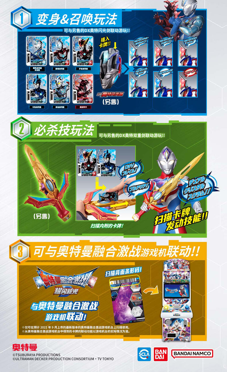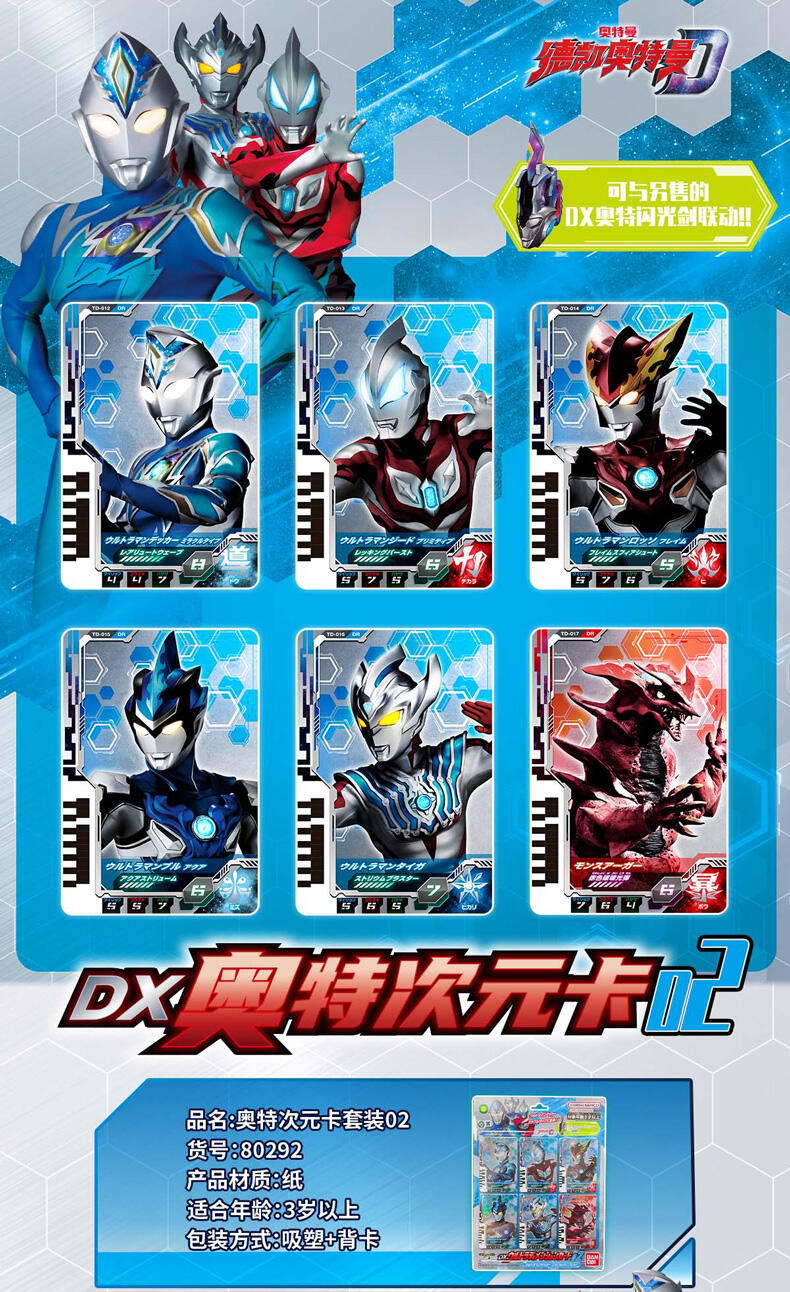 德凯奥特曼联动卡片套装2,与DX奥特闪光剑(另售)联动,变身与召唤奥特英雄与奥特怪兽,与DX奥特双重剑(另售)联动,发动必杀技,同时可以奥特曼融合激战游戏机台进行联动赏玩,在收集更多卡片尽情玩耍!