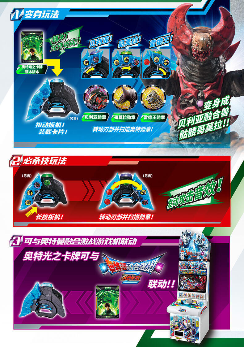 可与泽塔升华器(另售)联动,装入卡牌发光发声,变身泽塔奥特曼,依次扫描不同勋章勋章,发光发声,变身泽塔奥特曼不同形态;变身后,长按扳机,装入卡牌或者扫描勋章,发动必杀技,快来收集不同卡牌和勋章吧!