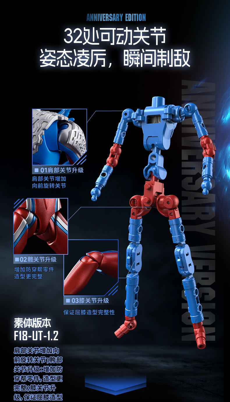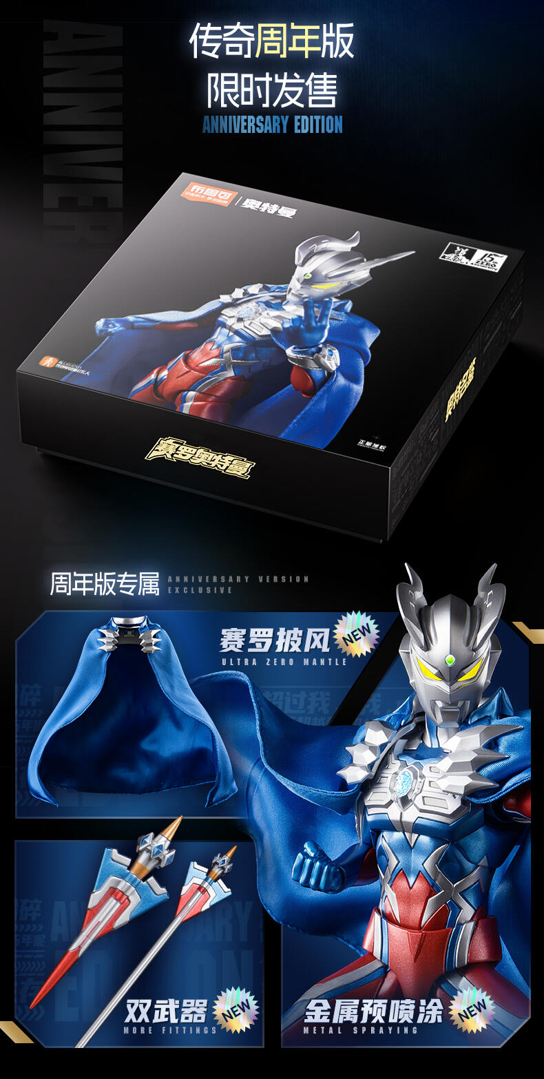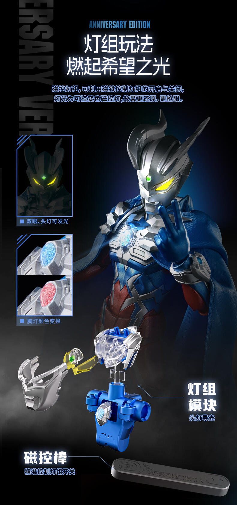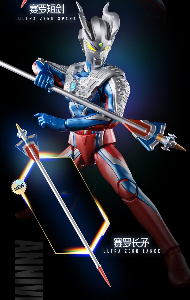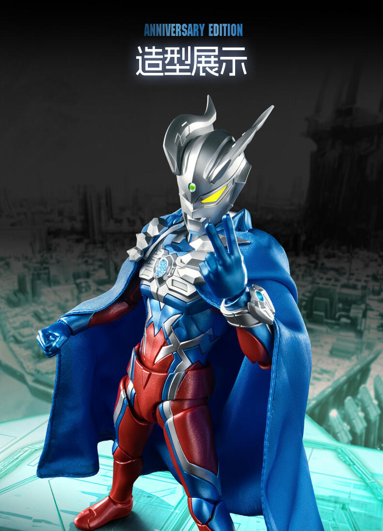 1、奥特曼IP,高度还原、周年限定版 ;2、多处出关节可动 ;3、场景道具、地面贴纸;双武器,金属预喷漆。灯组玩法,燃气希望之光。
