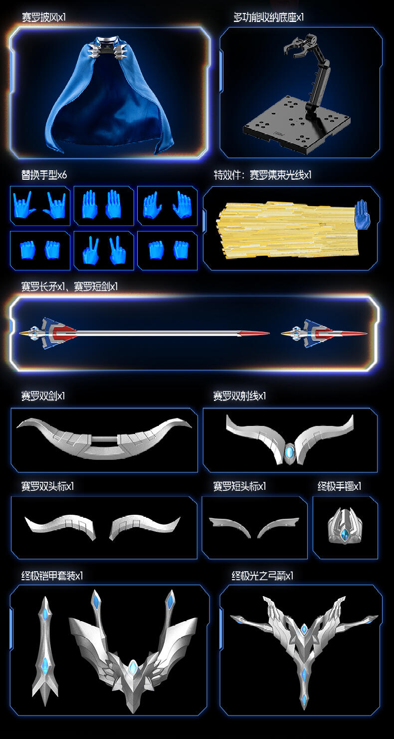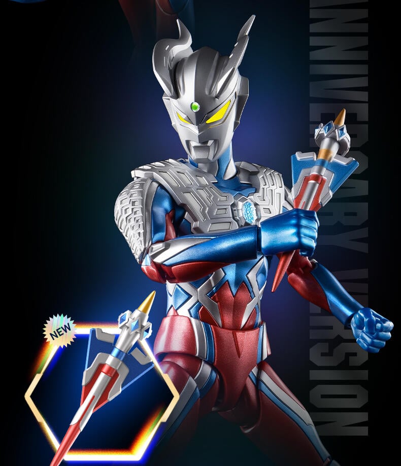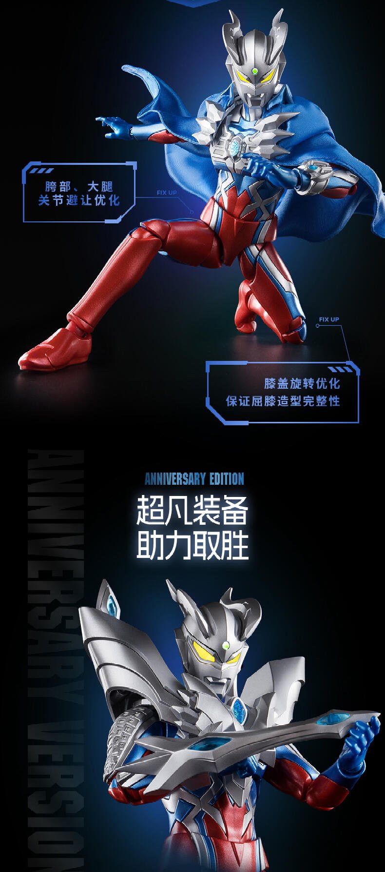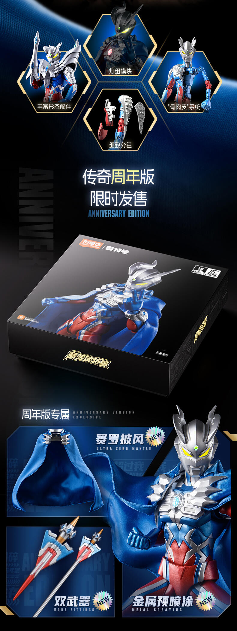 1、奥特曼IP,高度还原、周年限定版 ;2、多处出关节可动 ;3、场景道具、地面贴纸;双武器,金属预喷漆。灯组玩法,燃气希望之光。