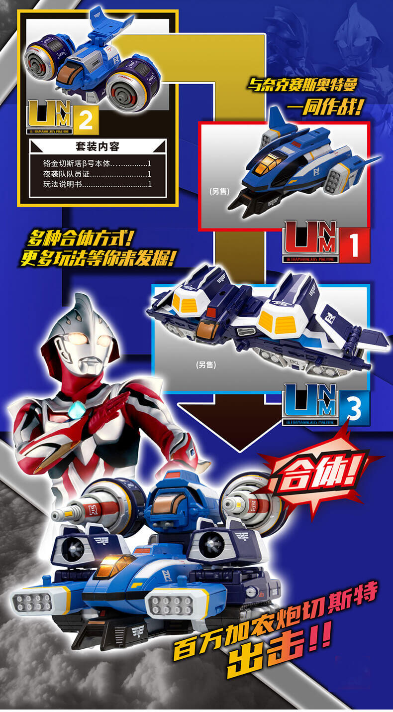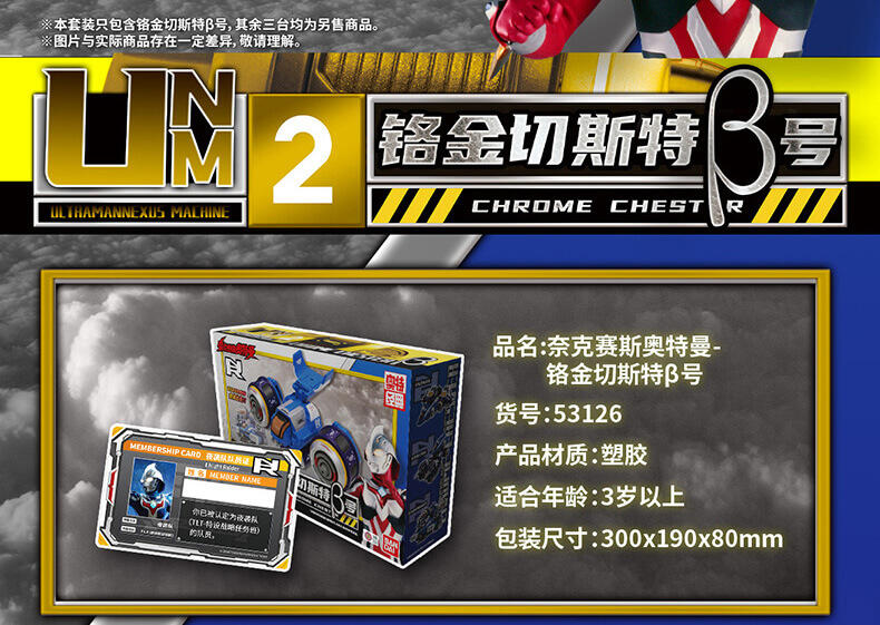 奈克赛斯奥特曼-铬金切斯特β号可配合铬金切斯特α号、铬金切斯特γ号、铬金切斯特δ号(均为另售)合体转换为突击型切斯特与挖掘型切斯特、百万加农炮切斯特,与奈克赛斯奥特曼一同战斗,附送1枚队员证,更多合体玩法等你发掘!