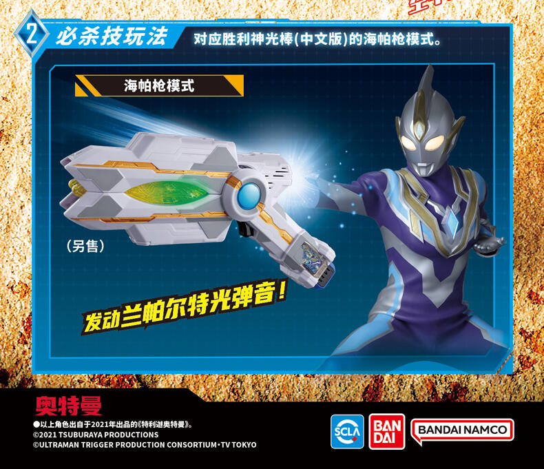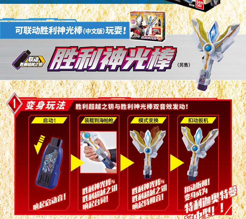 本体可发声,拥有胜利超越之钥模式与音效模式,可长按转换两种模式,与胜利神光棒(另售)联动,发出台词与变身音效。