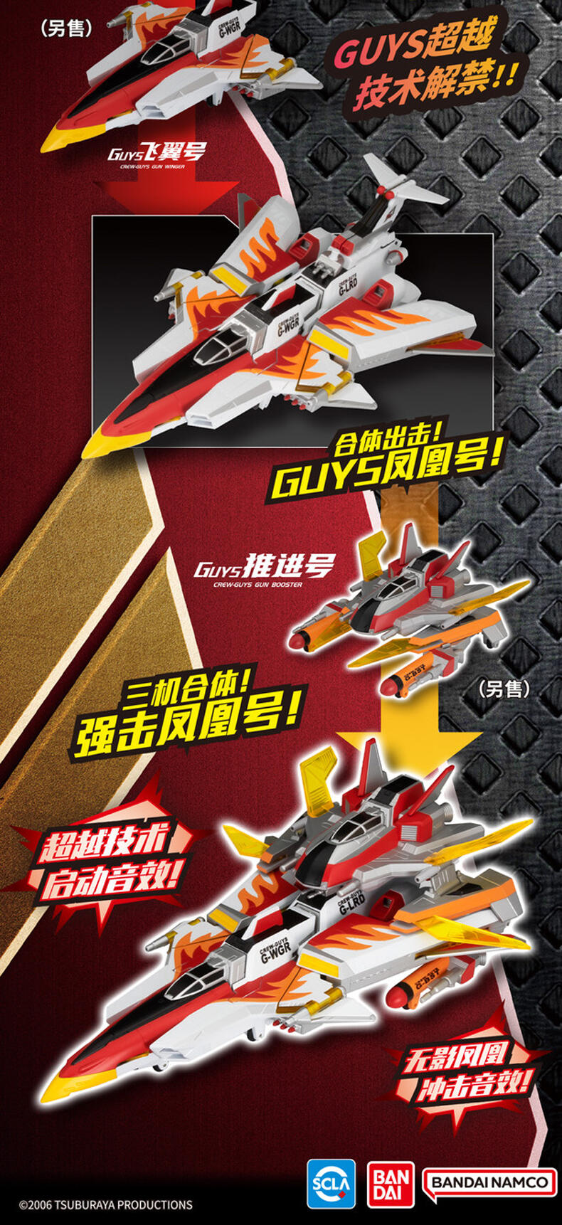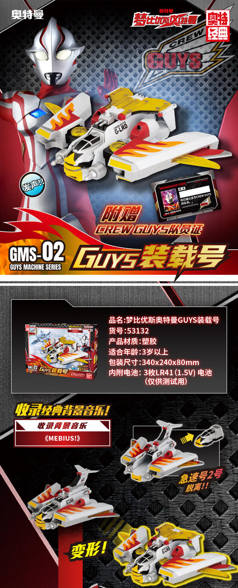 梦比优斯奥特曼-GUYS装载号拥有巡航模式与机动模式,可发声,启动Guys超越技术,收录经典背景音乐,可与飞翼号、GUYS凤凰号(另售)三体合一变形玩耍,附送一张队员证一起与梦比优斯奥特曼一同奋斗!