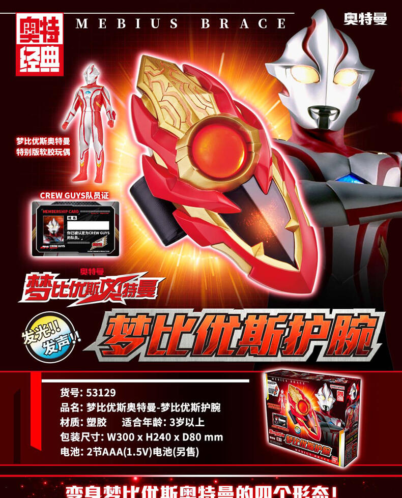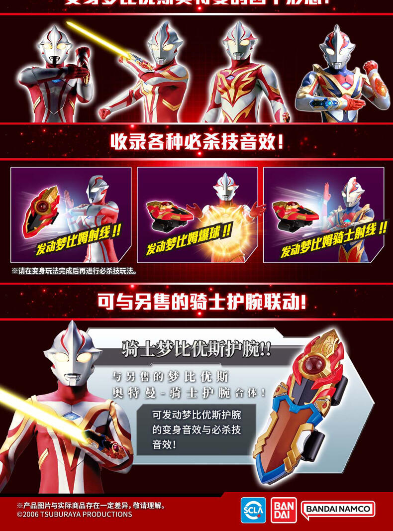 梦比优斯护腕短按/长按按钮A,甩动手腕,旋转水晶,可变身梦比优斯奥特曼3种形态,变身后可通过按钮发动必杀技,可与另售的骑士梦比优斯护腕合体,发动梦比优斯勇气形态的变身音效与必杀技音效。