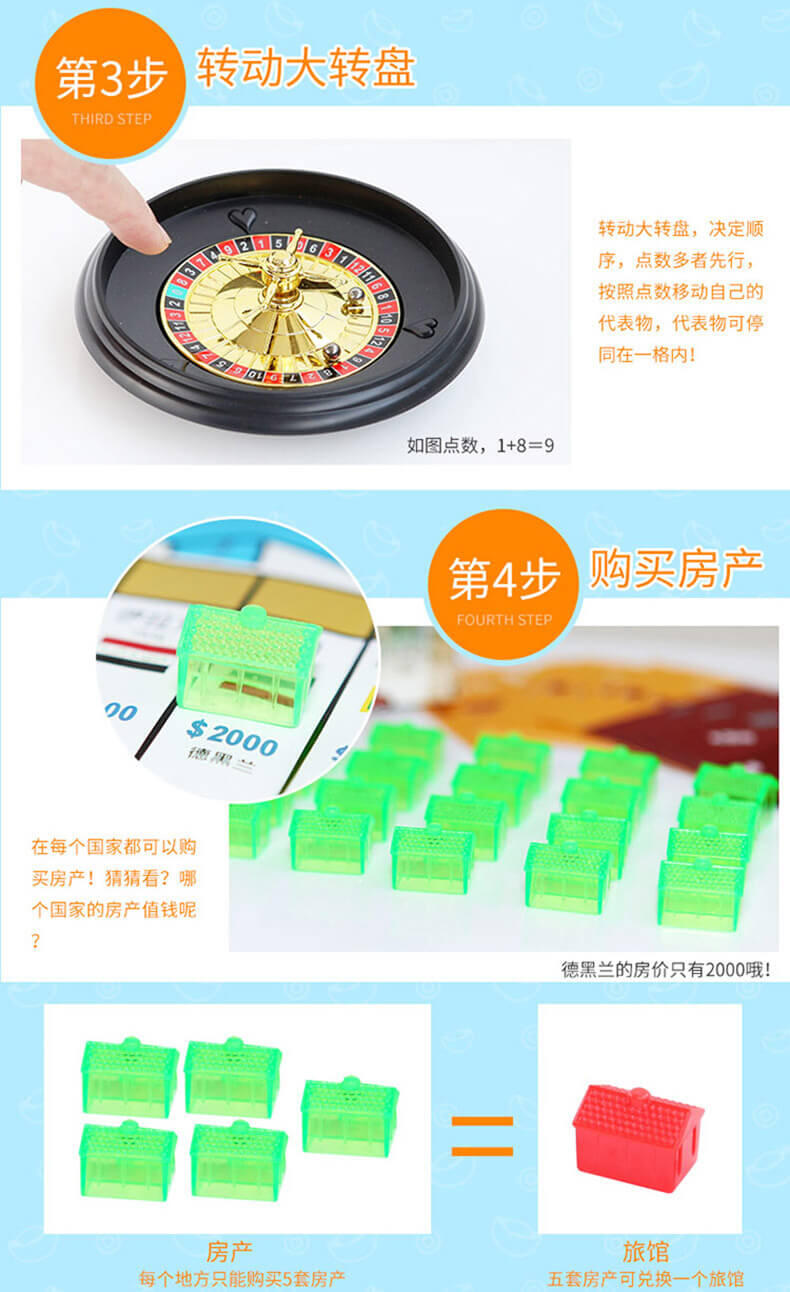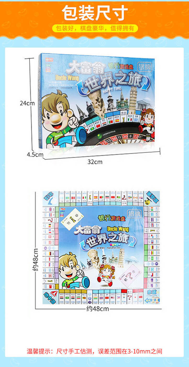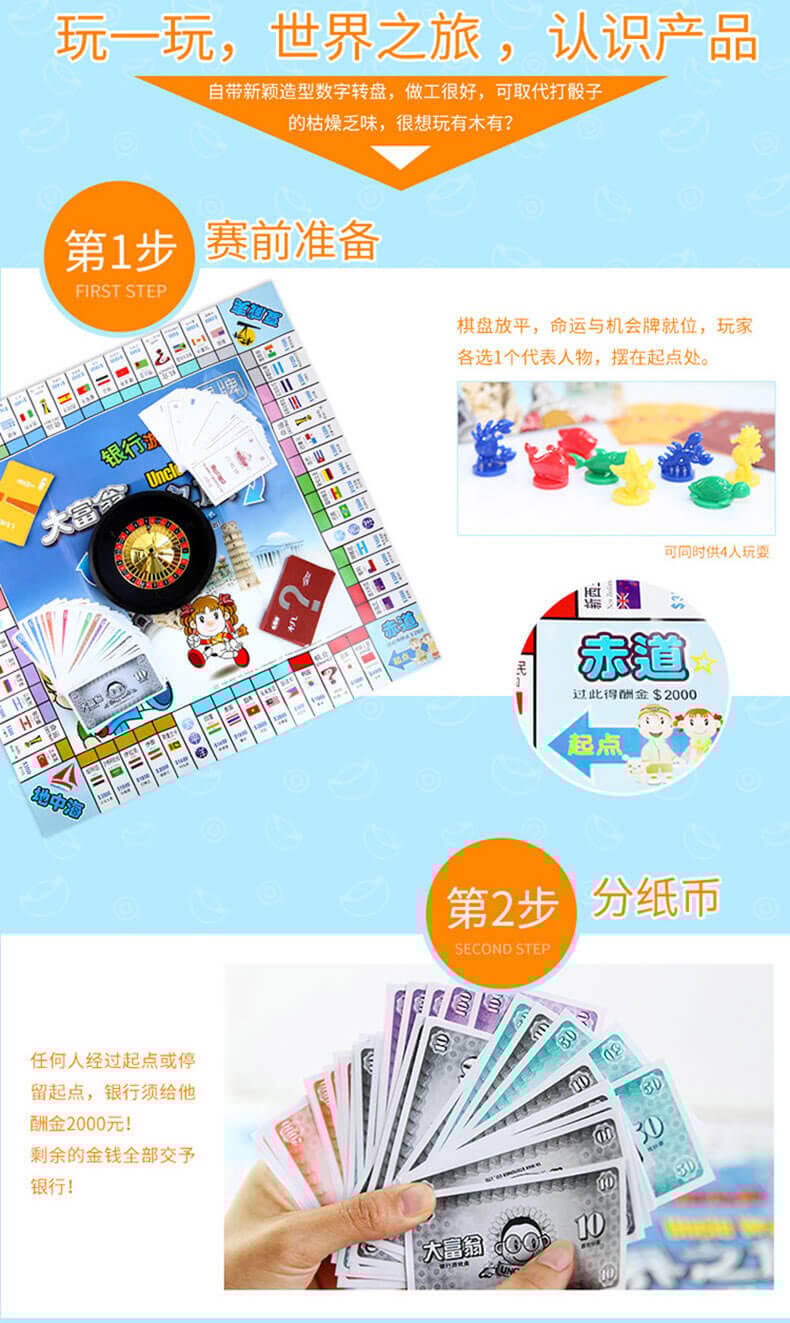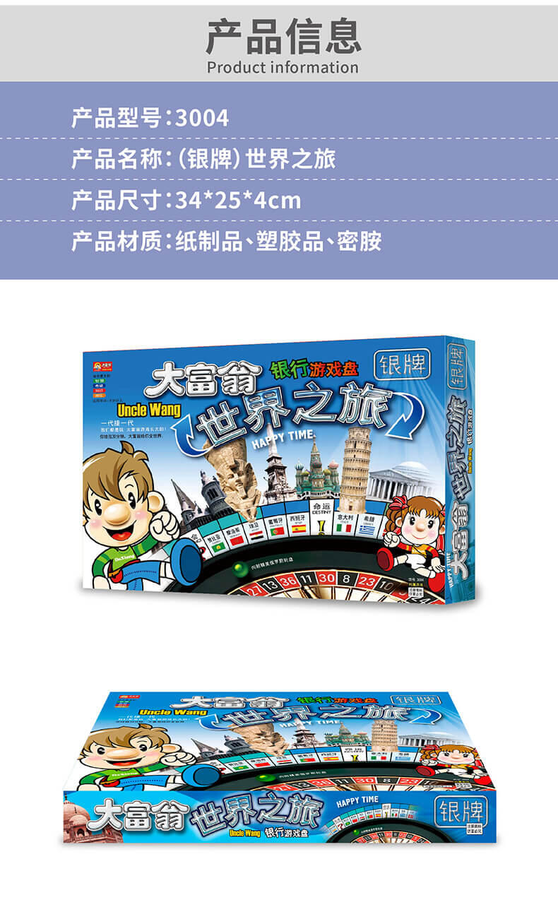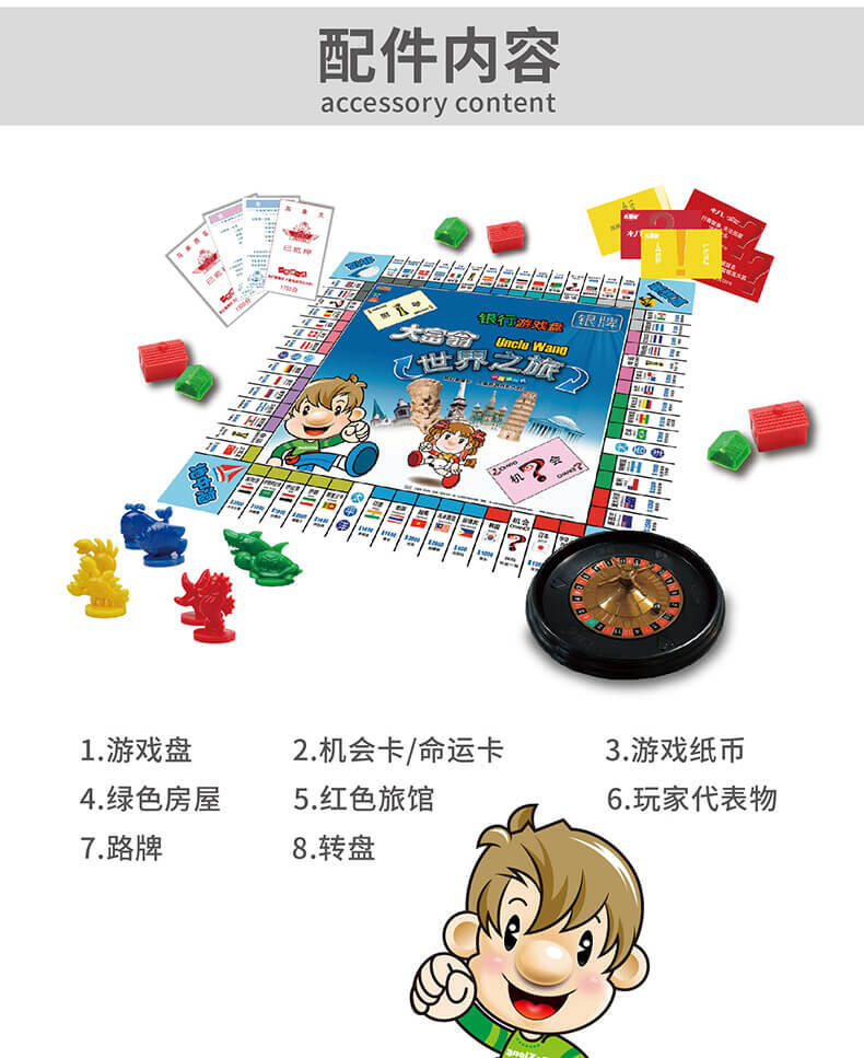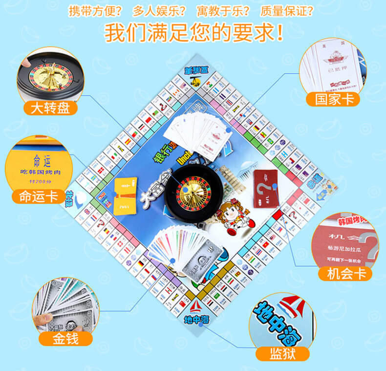 大富翁游戏广受欢迎,经久不衰,小朋友能在本游戏中培养理财能力,同时还会在游戏中进行挫折教育,在启迪智力的同时,家长与孩子之间的感觉也得到增进。一代接一代,我们都是玩大富翁游戏长大的!游戏特色:1、升级俄罗斯大转盘,代替传统骰子,拒绝枯燥的玩法,趣味性强。2、大气包装盒 收纳方便,告别繁琐,送礼也有面子。3、国家更多,8人玩耍更刺激,游戏持续时间更长更好玩,不再轻易破产。3、安全与外貌并重,激光切割全方位打磨抛光确保棋子光滑,可爱的动物造型深受小朋友喜欢。