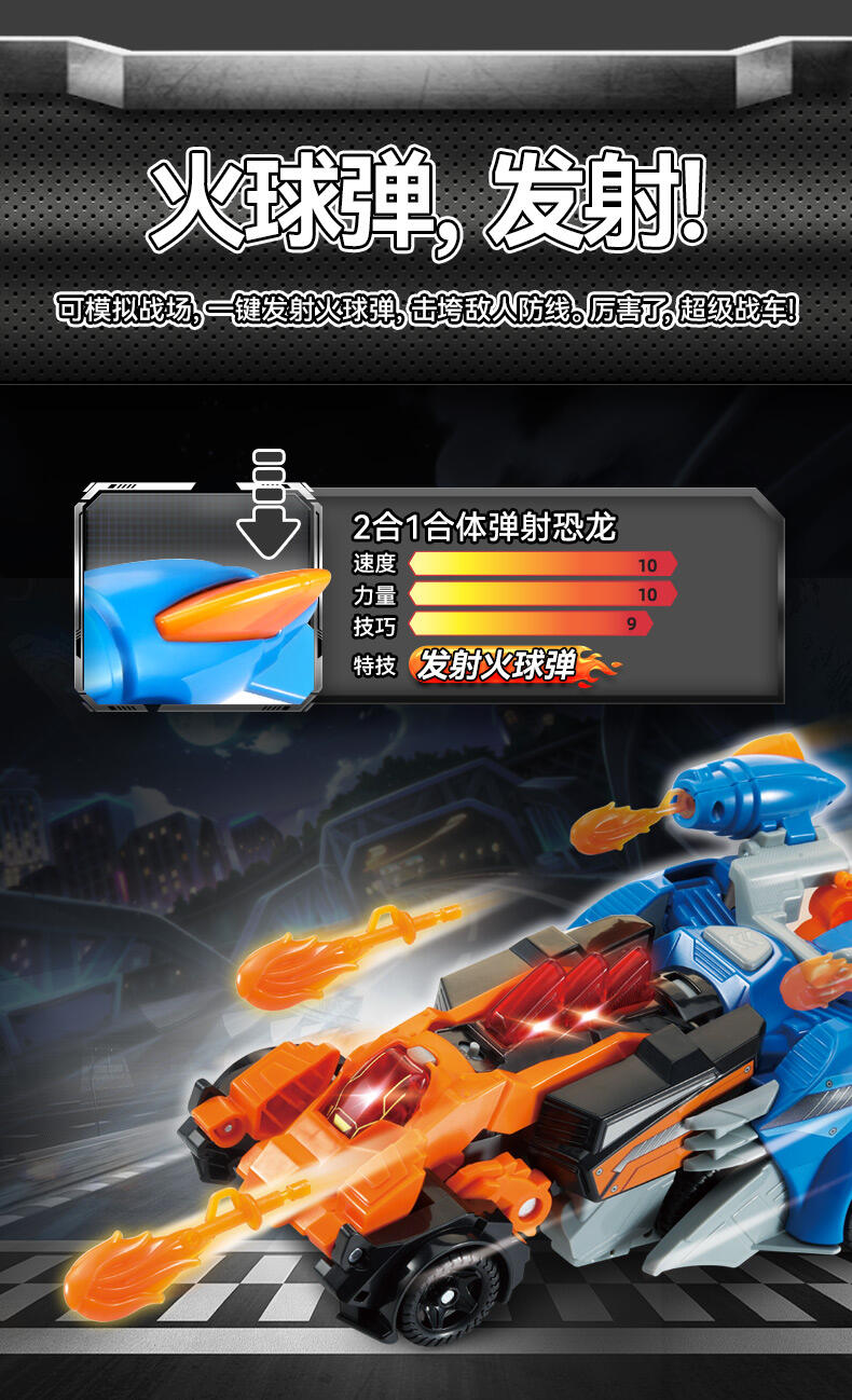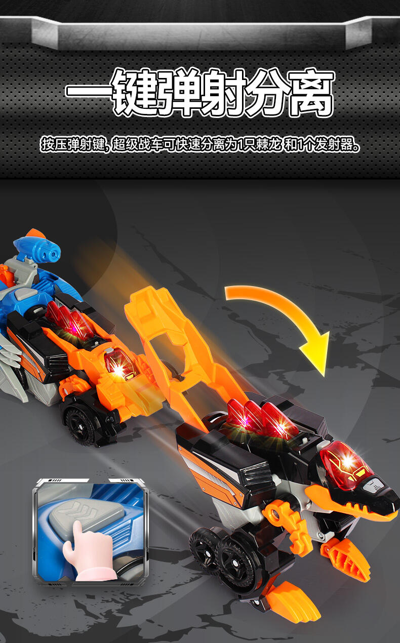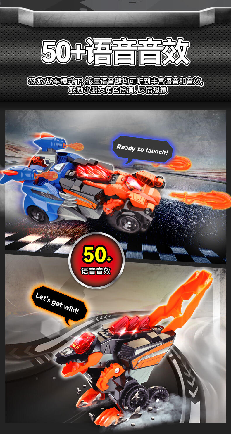 在恐龙模式下,按语音键可听到带有炫酷声光效果的有趣的短语和恐龙声音;在战车模式下,按语音键可听到有趣的短语和赛车声音。在战车模式下,按一键变形键可自动从战车模式切换到恐龙模式。在超级战车模式下,按开机键可以启动战车并变形为超级棘龙