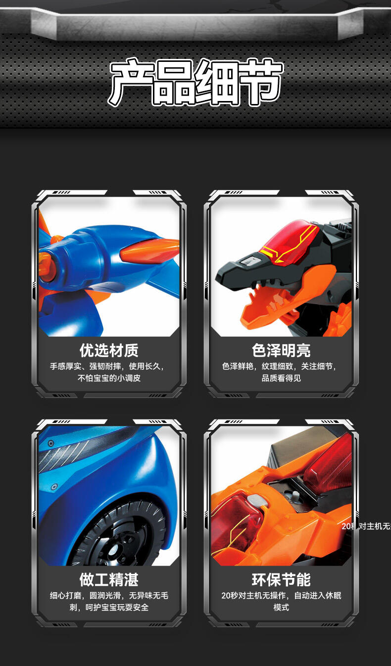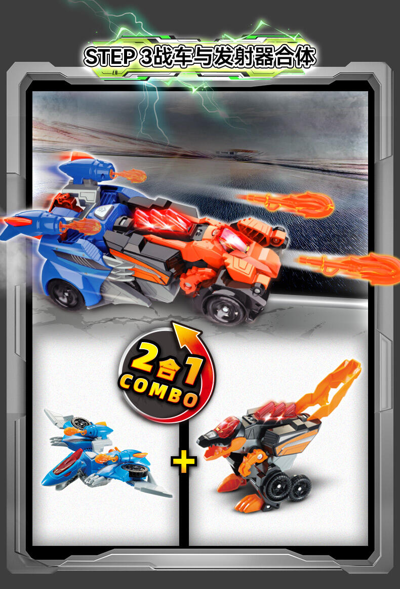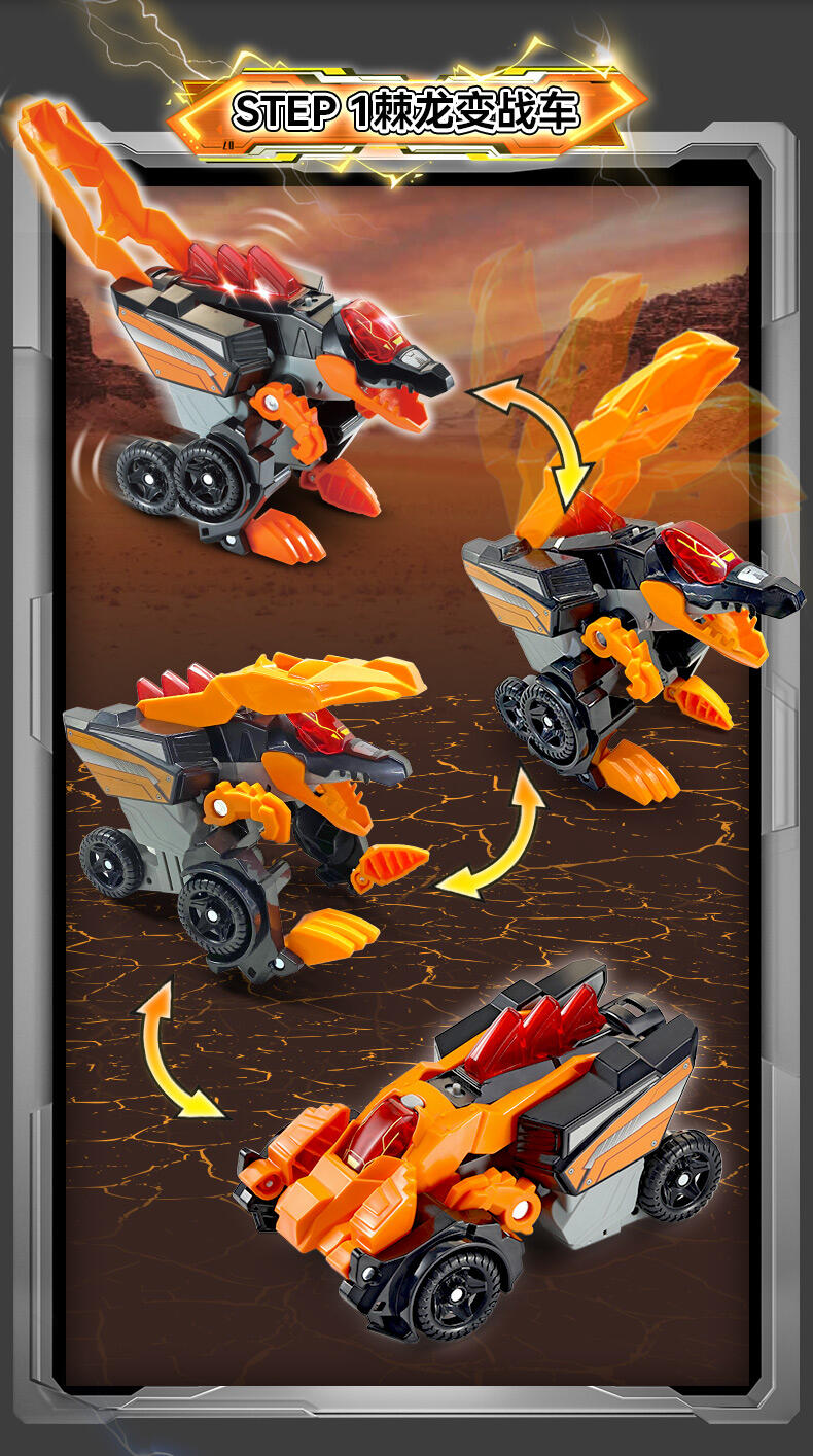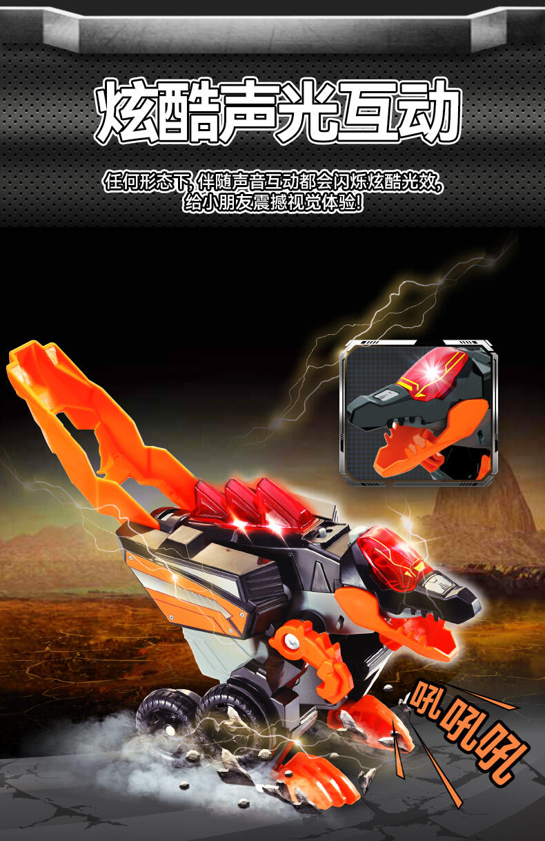 在恐龙模式下,按语音键可听到带有炫酷声光效果的有趣的短语和恐龙声音;在战车模式下,按语音键可听到有趣的短语和赛车声音。在战车模式下,按一键变形键可自动从战车模式切换到恐龙模式。在超级战车模式下,按开机键可以启动战车并变形为超级棘龙