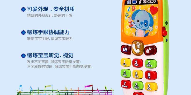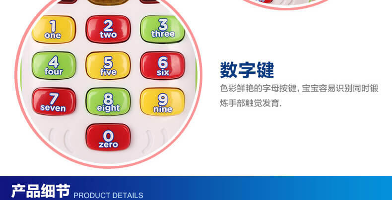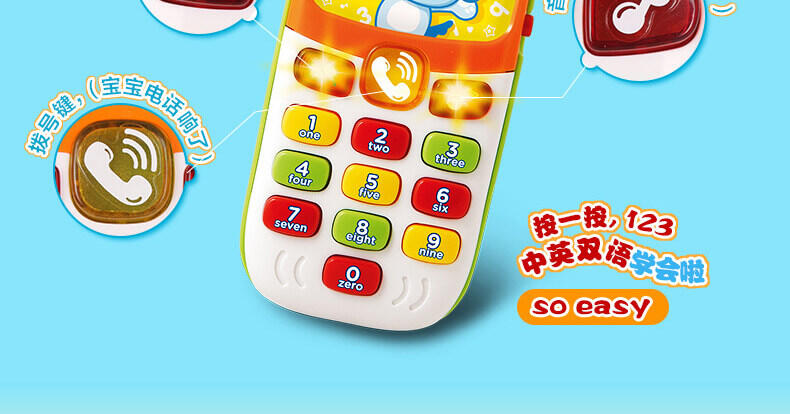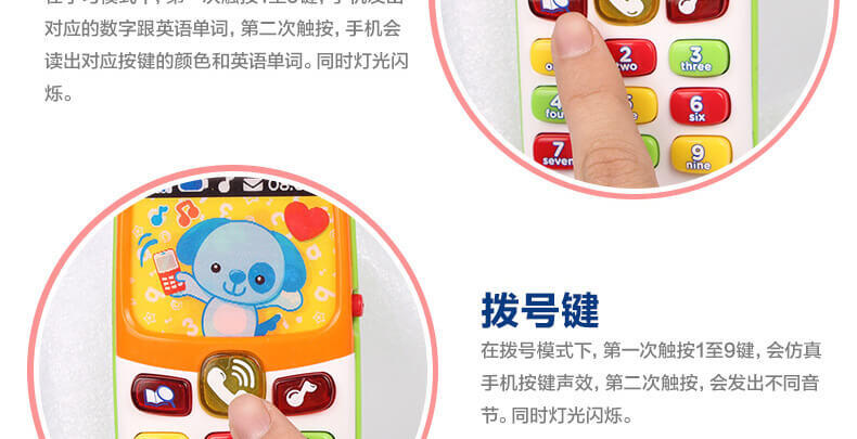 在学习模式下,第一次触摸按键1-9,手机发出对应的数字跟英语单词,第二次触摸按键,手机会读出对应按键的颜色和英语单词,同时灯光闪烁。