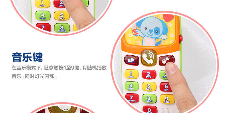 在拨号模式下,一次触按1-9键,会仿真手机按键声效,第二次触按,会发出不同的音节,同时灯光闪烁。