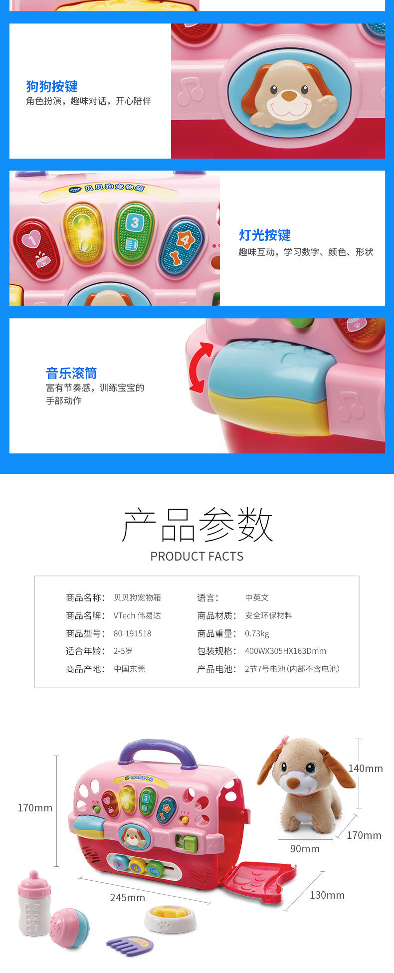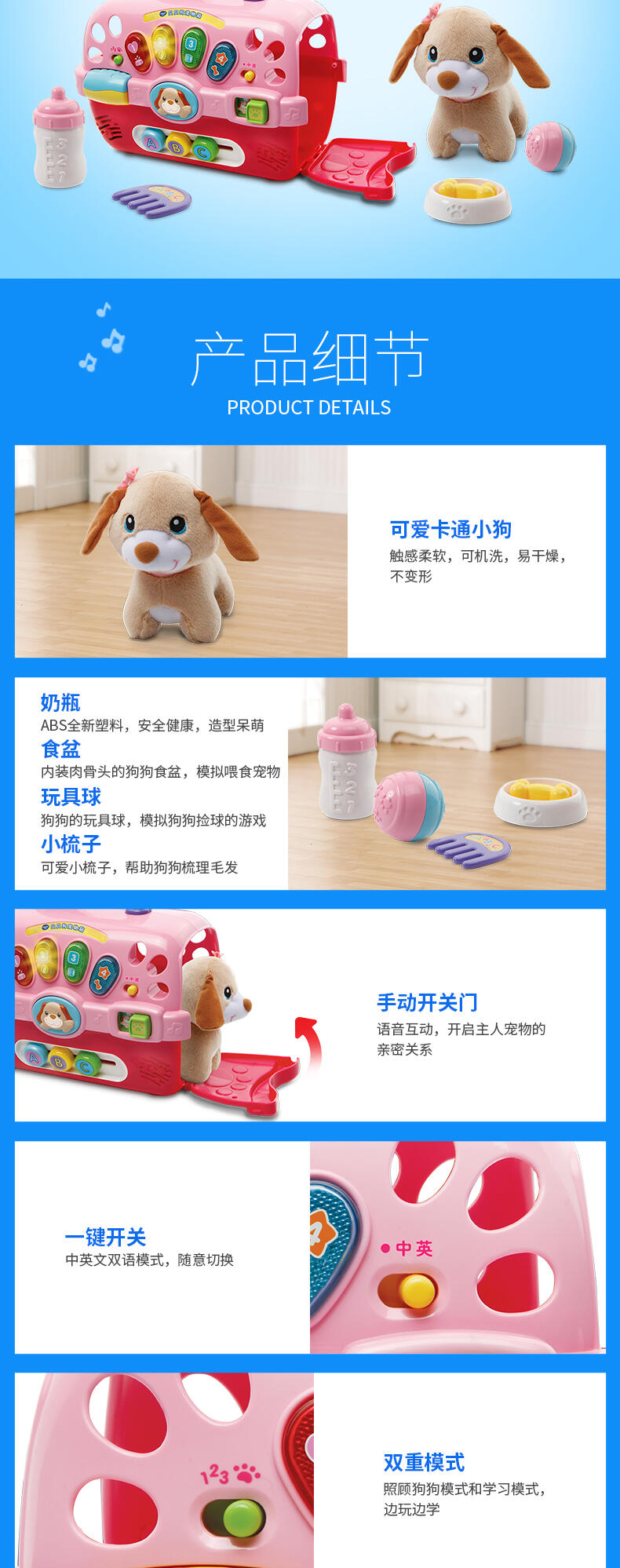 3.柔软毛绒狗狗,大小适合搂抱,可水洗