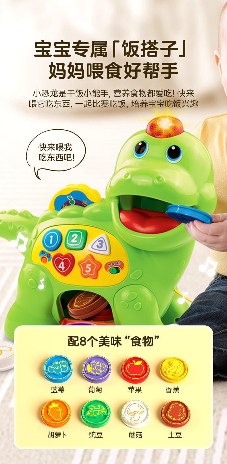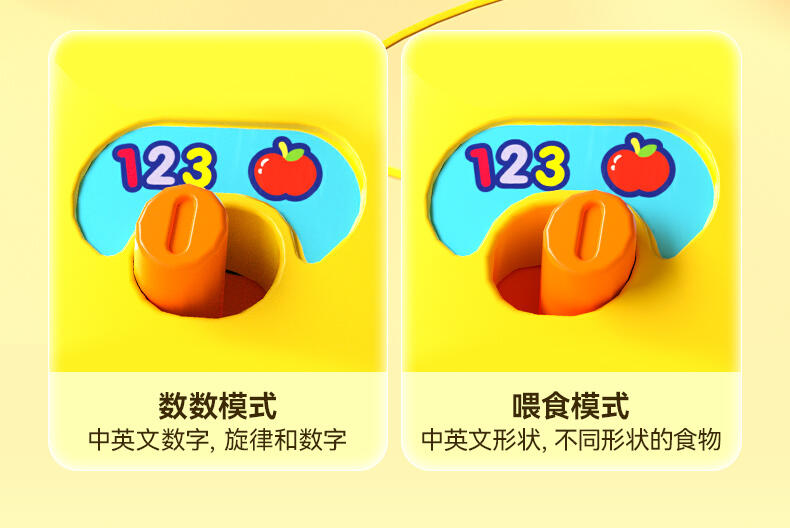 投喂智能识别8种食物(食物的颜色、名称、功效和数量); 玩互动喂食游戏,投喂指定的食物或相应数量的食物; 帮助宝宝了解食物小知识,培养健康饮食好习惯; 多种玩法(坐玩,推玩,拖玩)