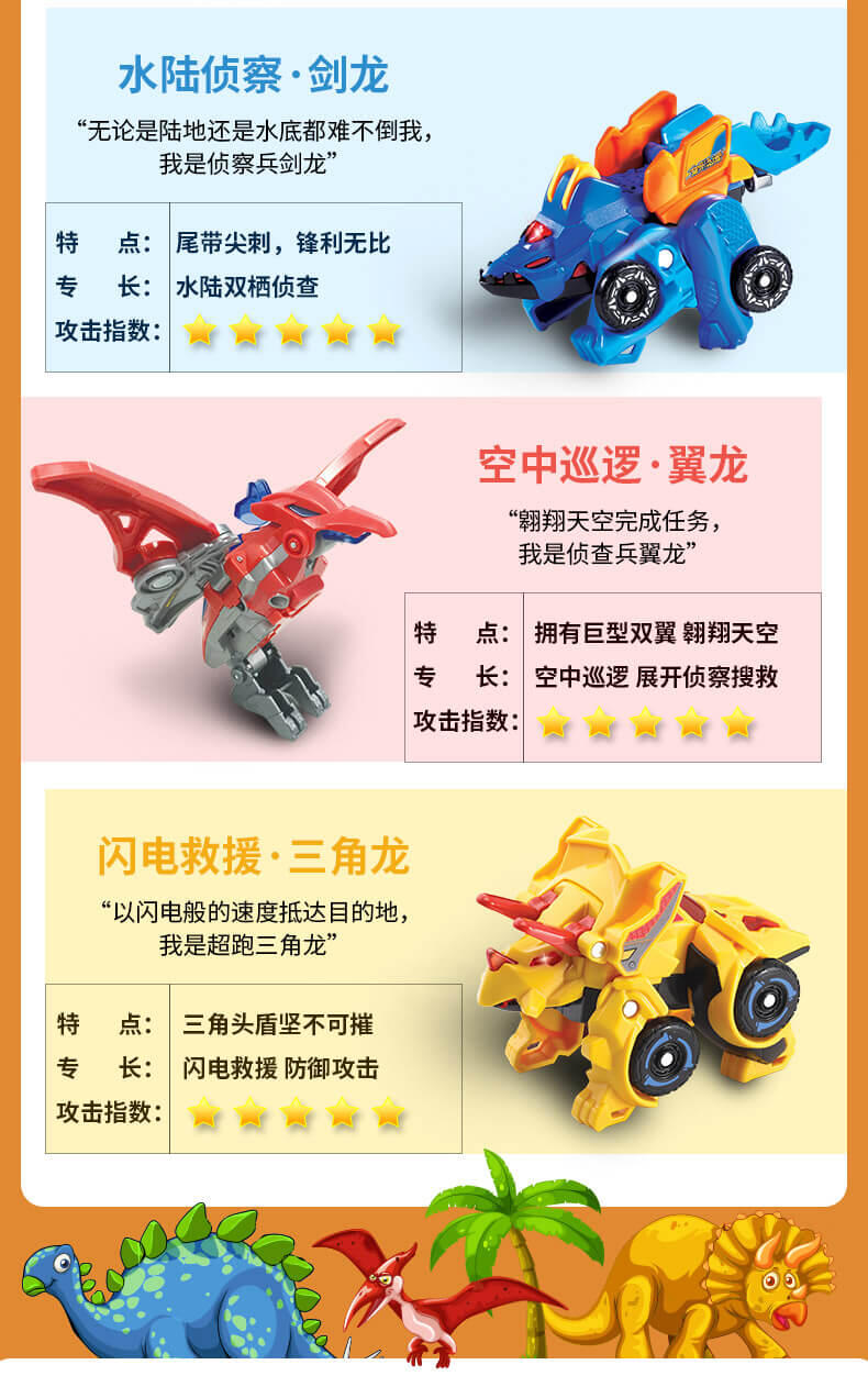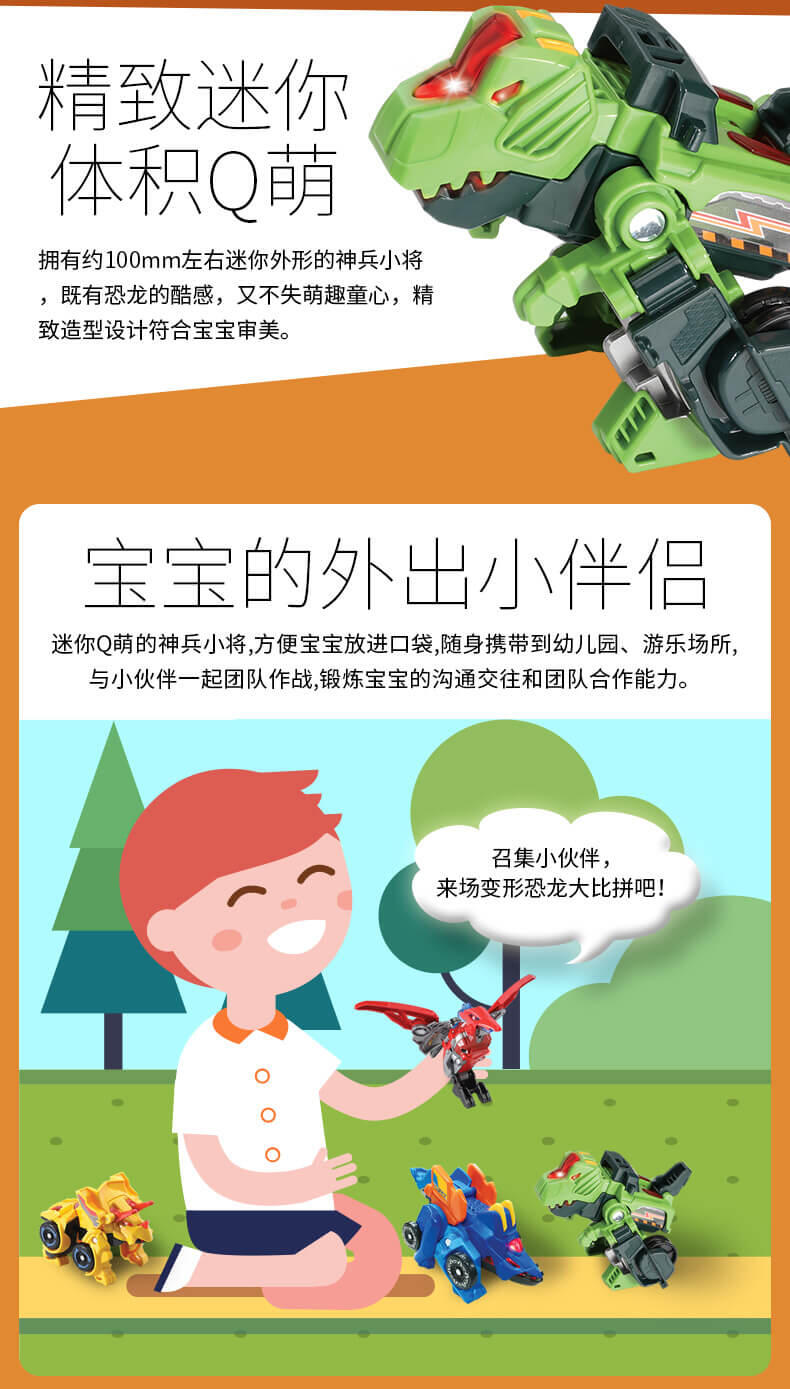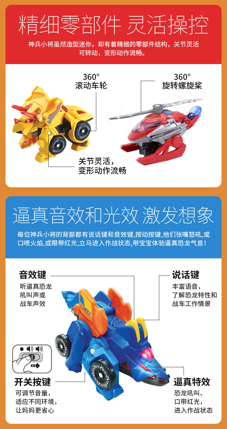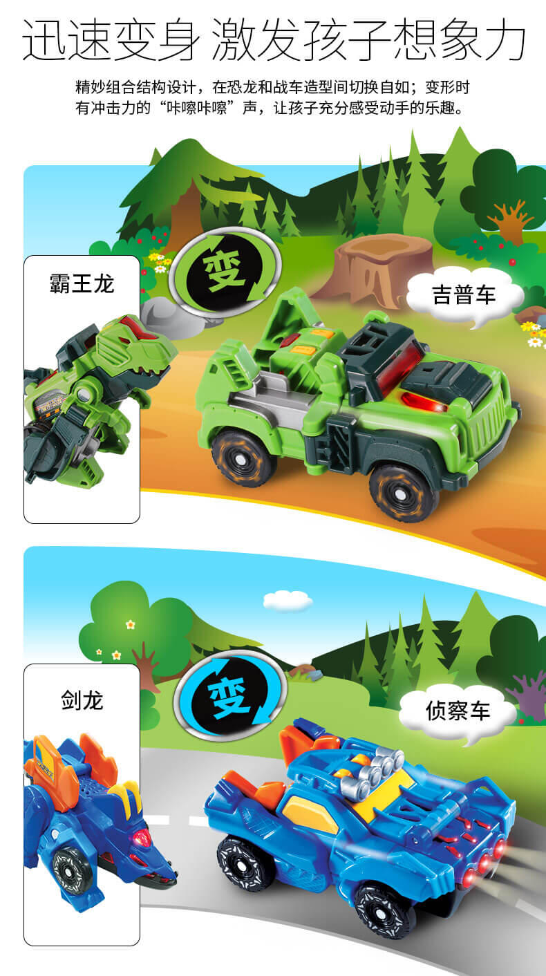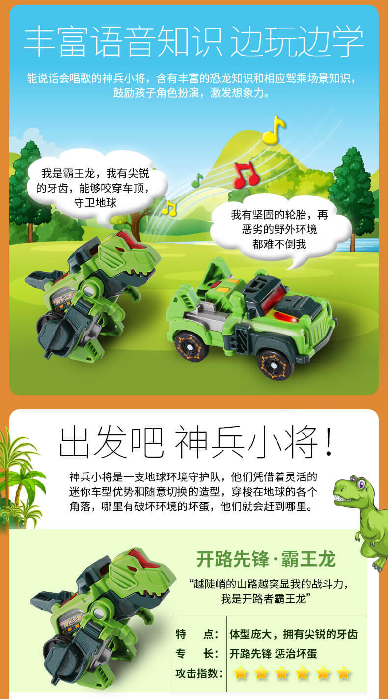 变形恐龙神兵小将·霸王龙,LED灯光,恐龙变吉普车,多达25种语音和音效。越是陡峭的山路越能凸显霸王龙的战斗力,它是开路者霸王龙。