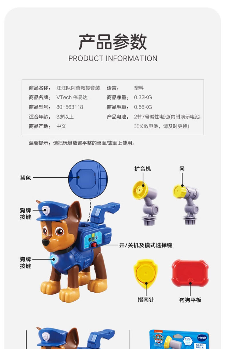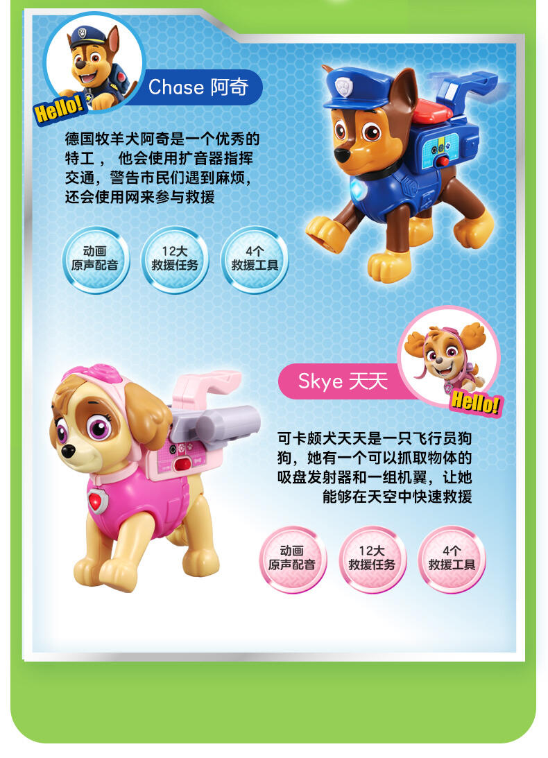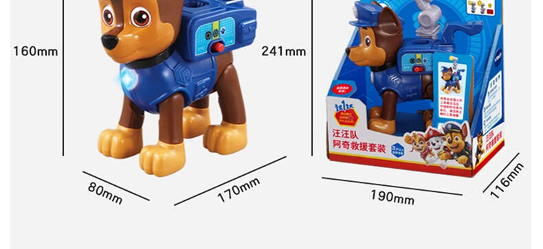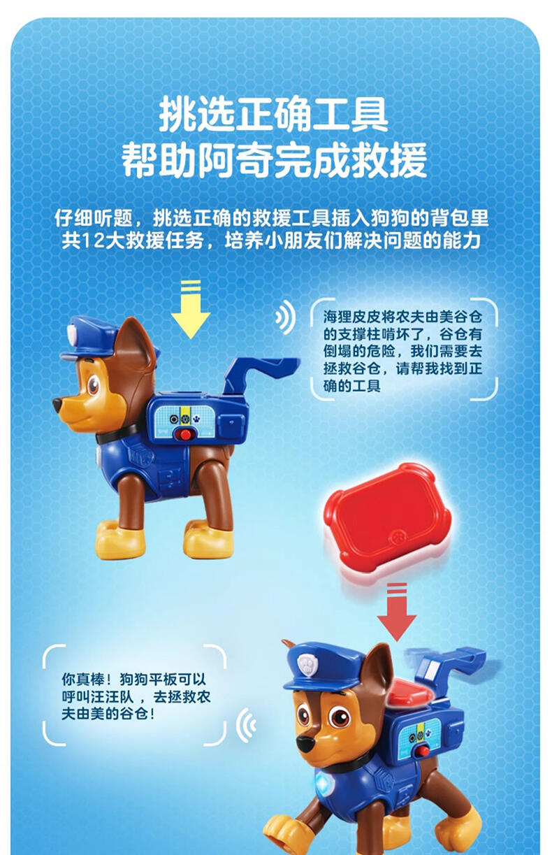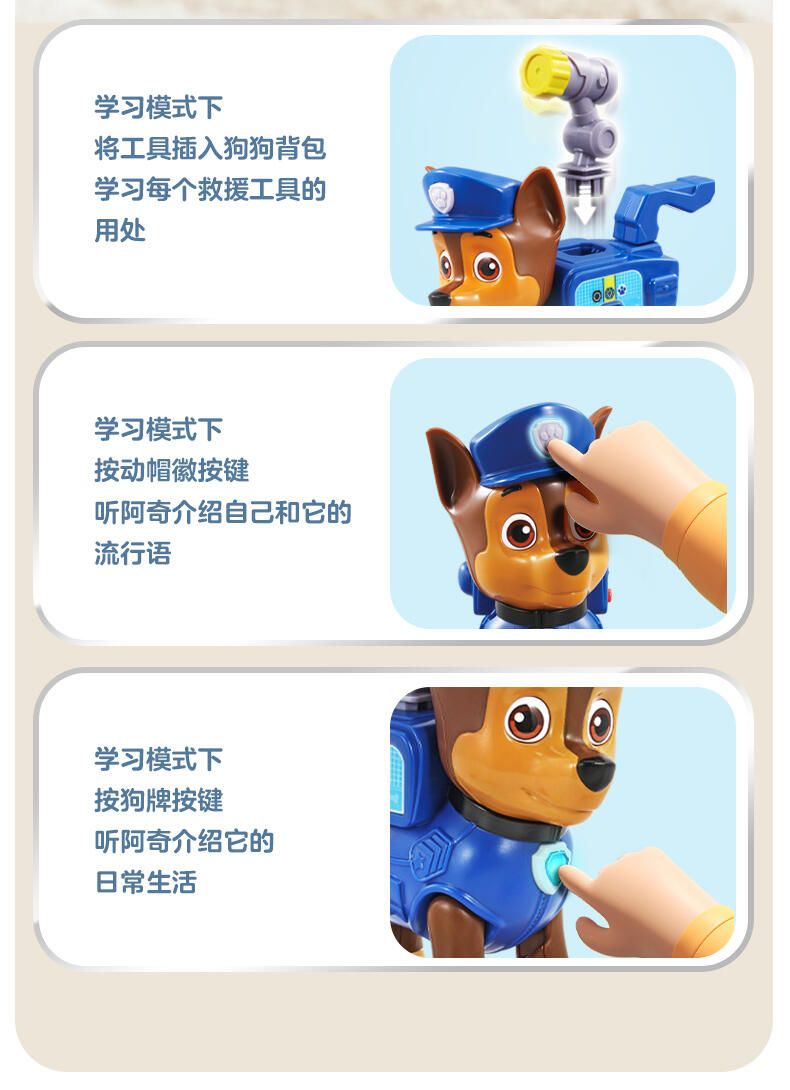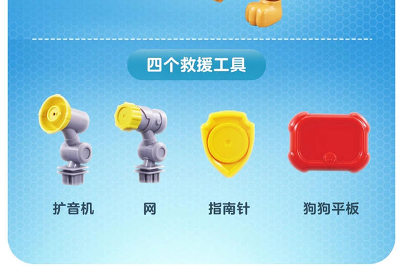 汪汪队天天救援套装包含了动画片汪汪队立大功的成员天天以及相应的4个救援工具。采用动画片原声配音,按键或将工具插入背包听天天介绍它的日常生活及救援工具,跟着天天去执行各种救援任务,学会使用正确的救援工具,体验角色扮演的乐趣