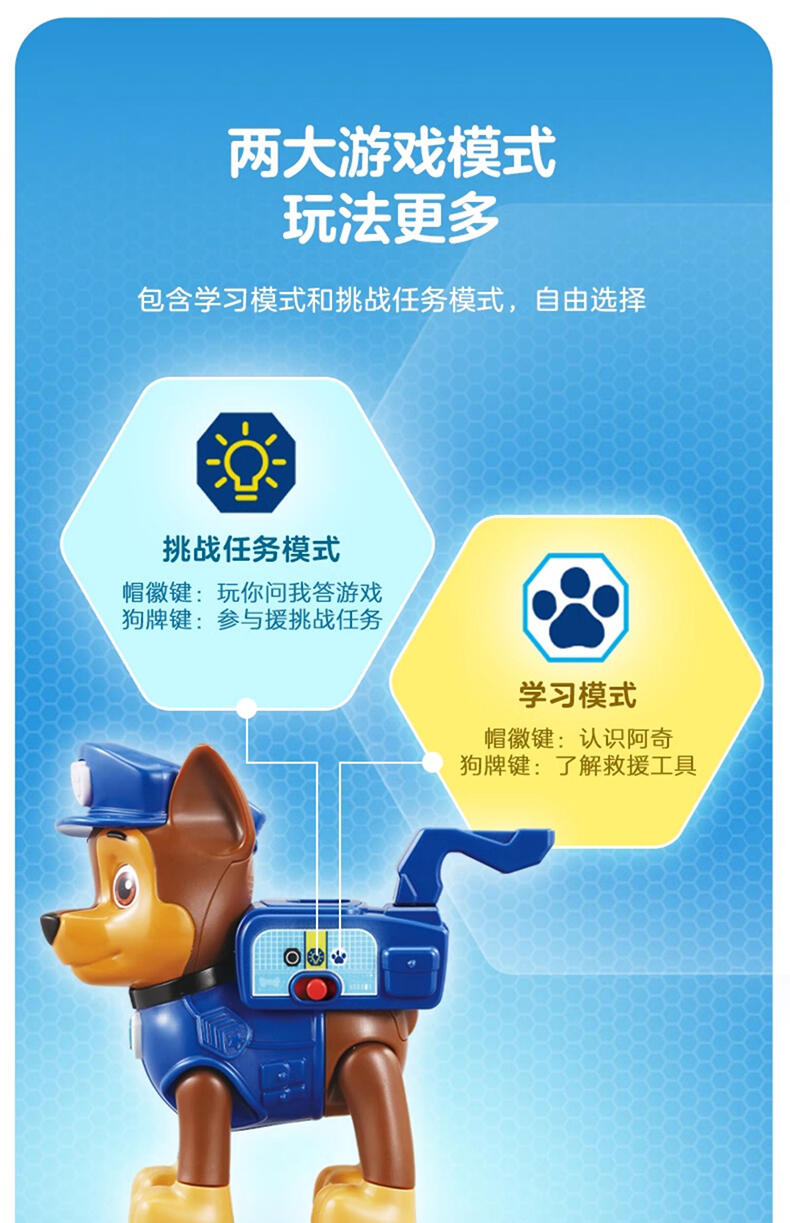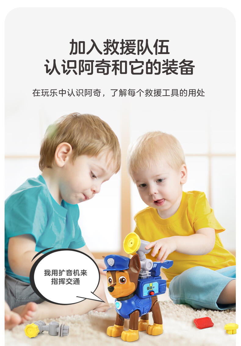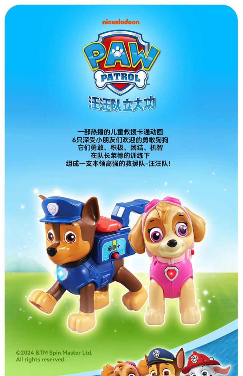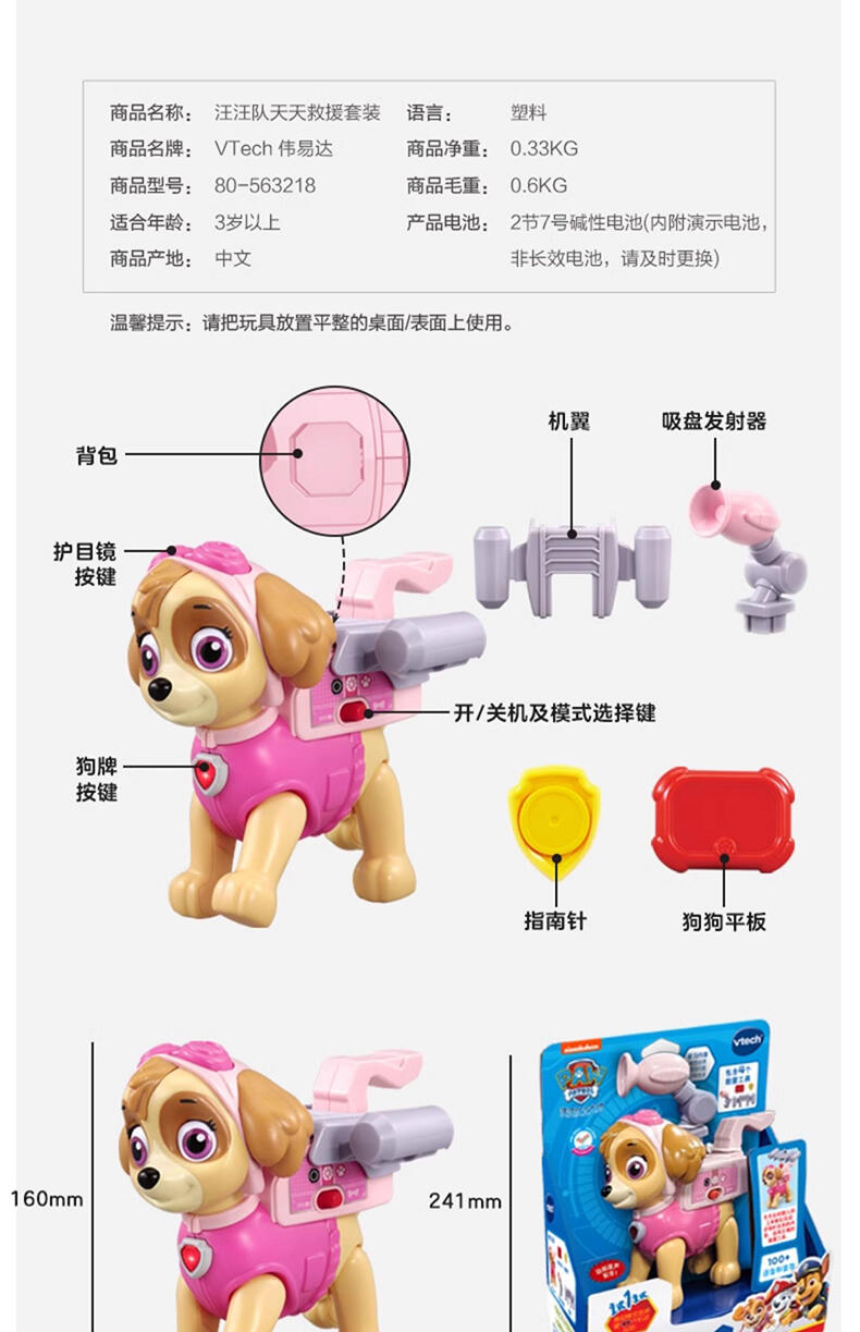汪汪队天天救援套装包含了动画片汪汪队立大功的成员天天以及相应的4个救援工具。采用动画片原声配音,按键或将工具插入背包听天天介绍它的日常生活及救援工具,跟着天天去执行各种救援任务,学会使用正确的救援工具,体验角色扮演的乐趣