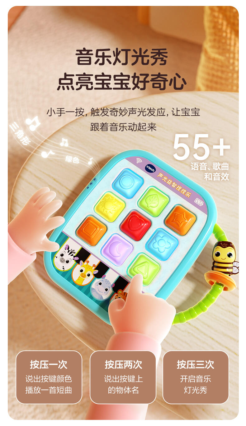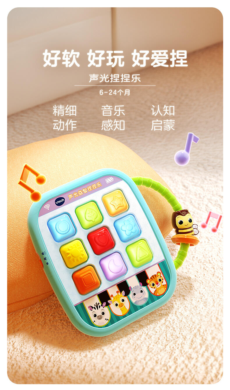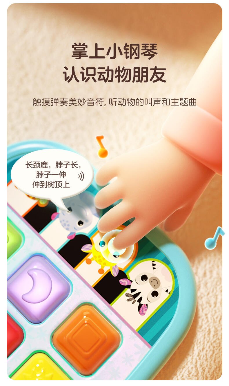 好软好玩好爱捏!可随身携带的玩具平板包含55条语音、歌曲和音效。柔软的按键、学习颜色和形状,丰富多彩的灯光效果让宝宝爱不释手,动物钢琴键弹琴或听歌认识动物小伙伴在玩乐中认识颜色、形状和动物!