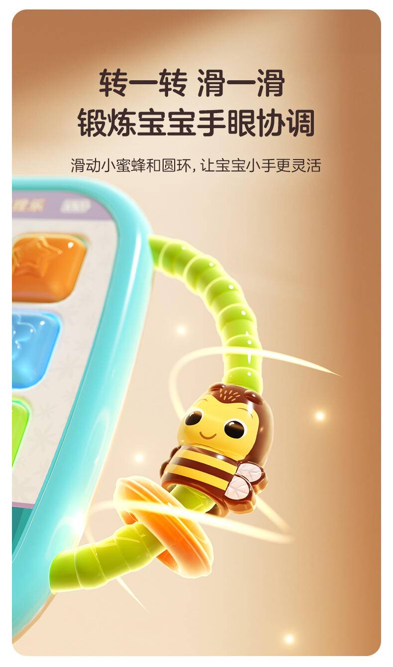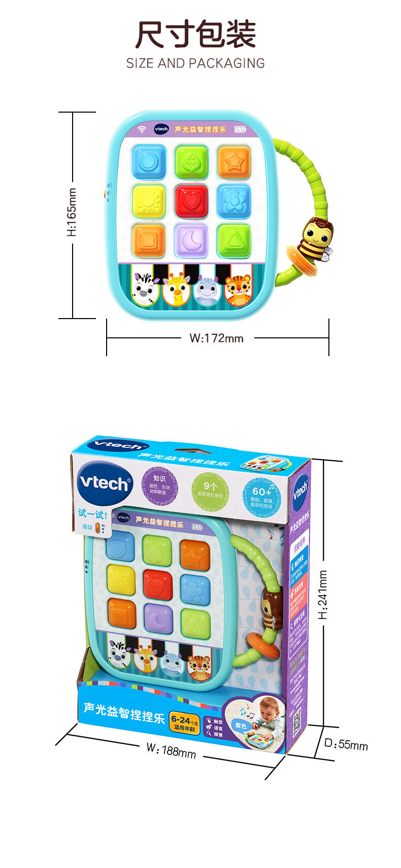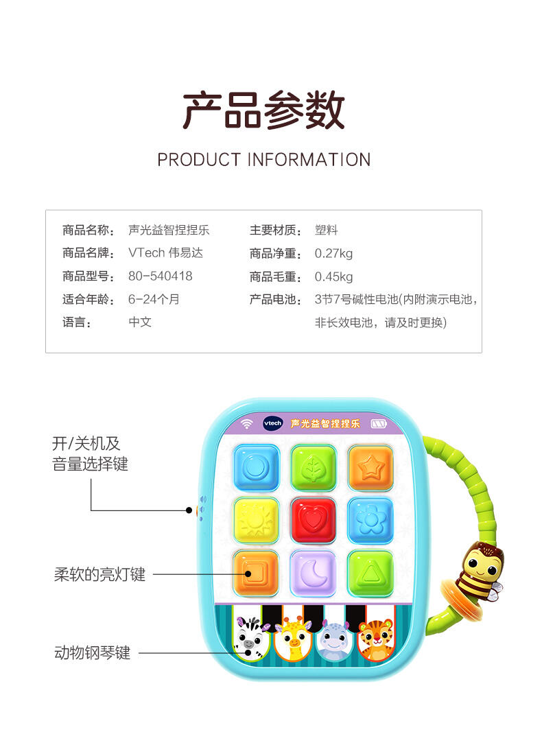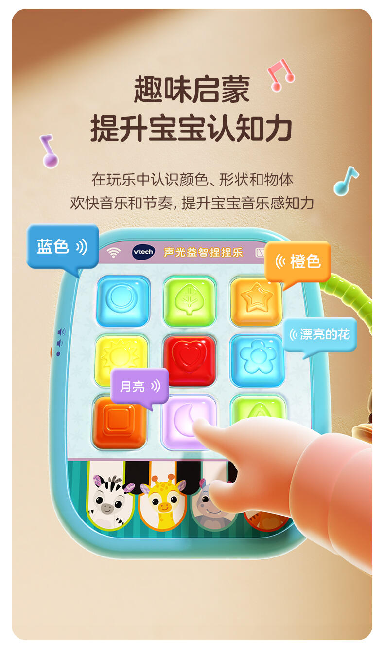 好软好玩好爱捏!可随身携带的玩具平板包含55条语音、歌曲和音效。柔软的按键、学习颜色和形状,丰富多彩的灯光效果让宝宝爱不释手,动物钢琴键弹琴或听歌认识动物小伙伴在玩乐中认识颜色、形状和动物!