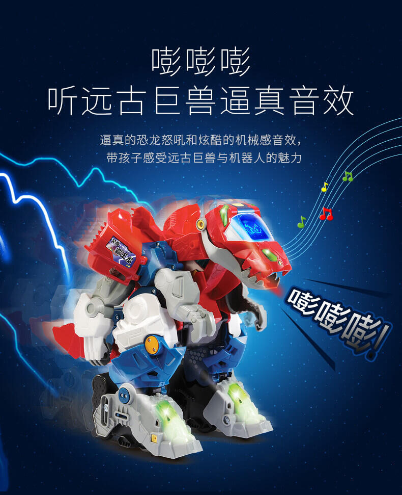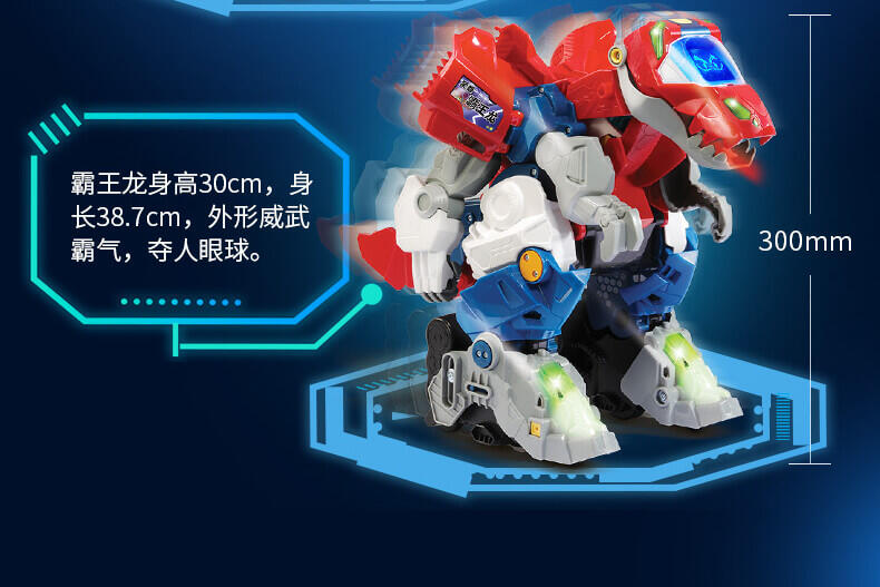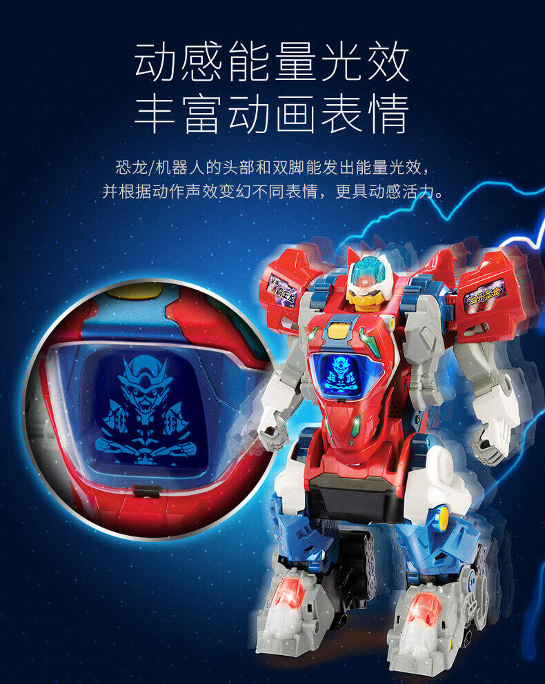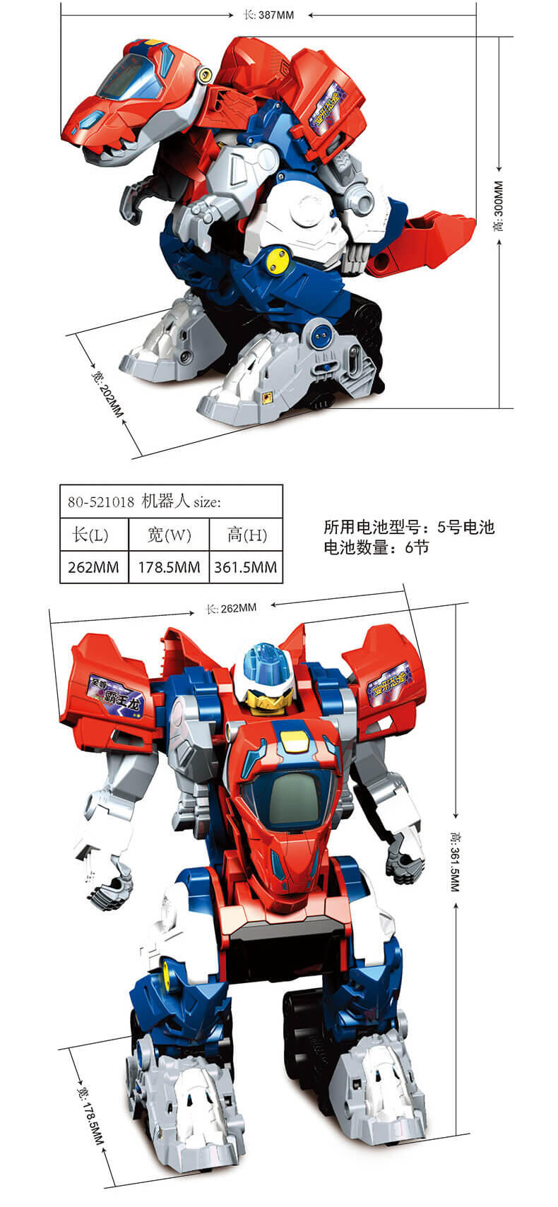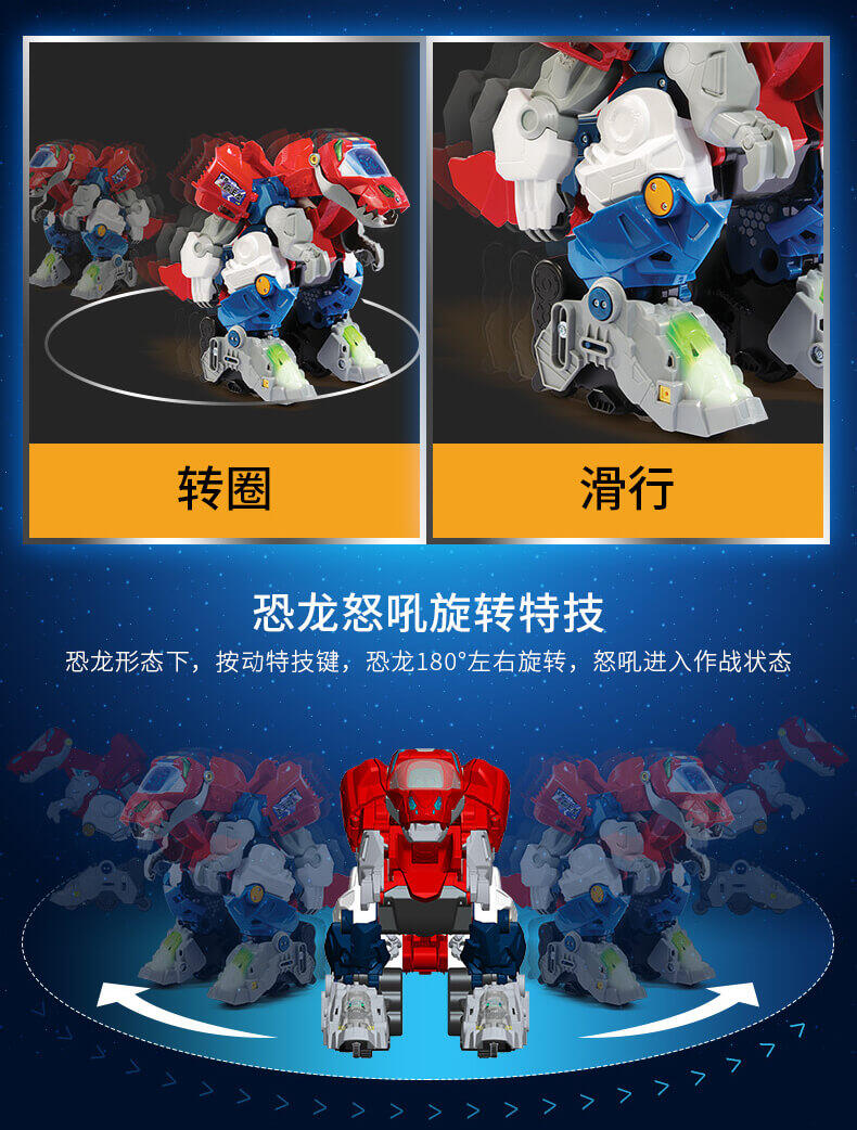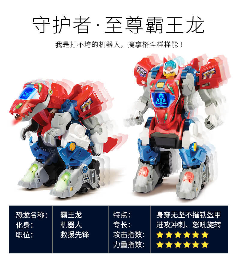 变形恐龙-守护者至尊霸王龙.一键遥控变形,仿真踏步机器人!炫酷一键变形,霸王龙变机器人,高大威猛巨无霸机器人身高36厘米,高大威猛,让孩子爱不释手,霸王龙身高30厘米,身长38.7厘米,外形威武,霸气夺人眼球.空旷地方可达80米超远遥控距离,让小朋友可以随心所欲遥控机器人,操纵恐龙.机器人关节灵活,双臂可前后摆动张开,膝关节可自由弯曲,伴随动感音效威猛向前行走。机器人形态下,按特技键,机器人将向前冲刺约两米;恐龙形态下,按特技键恐龙可以180度左右旋转怒吼,进入作战状态。逼真的恐龙怒吼和炫酷的机械感音效,带孩子感受远古巨兽与机器人的魅力。