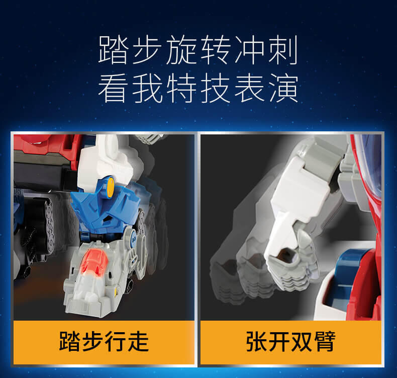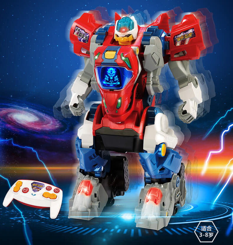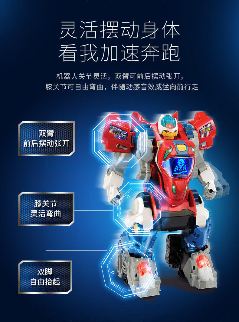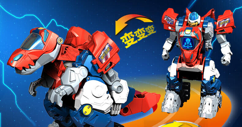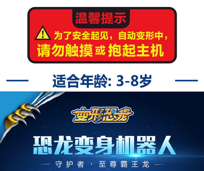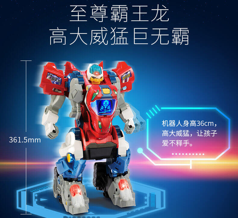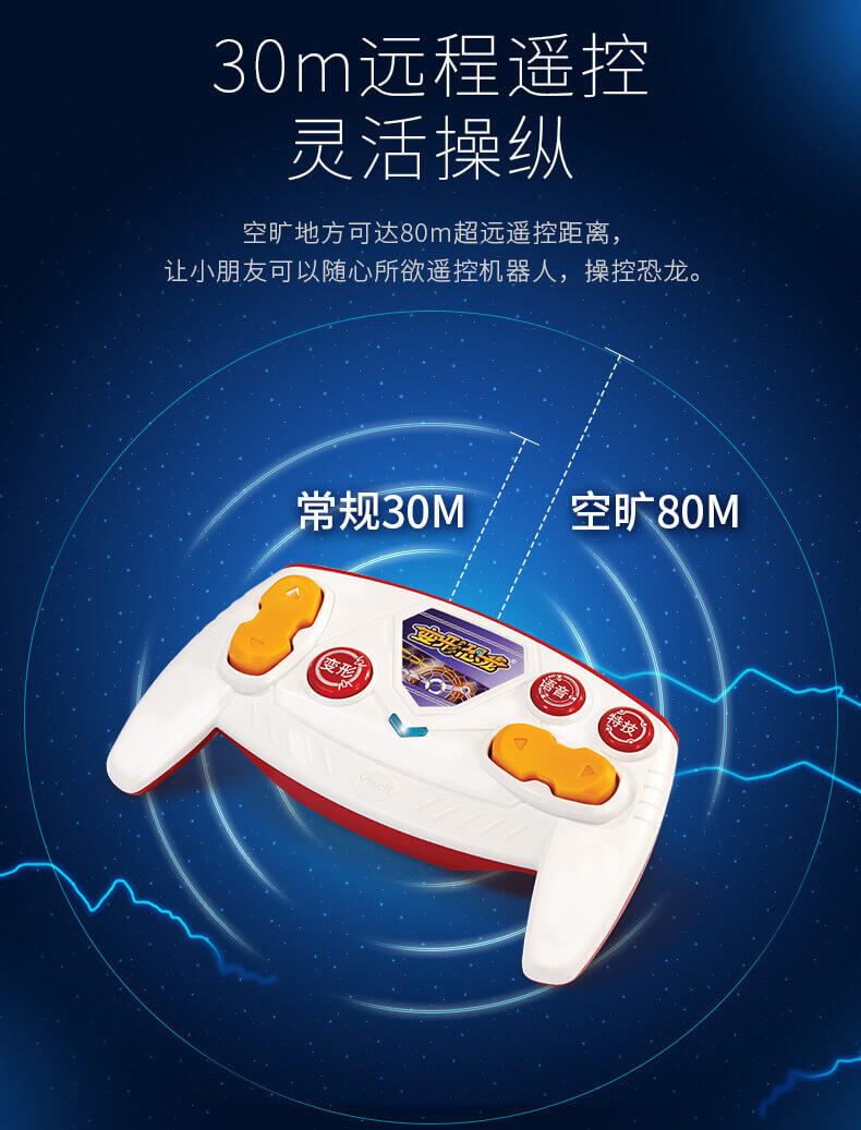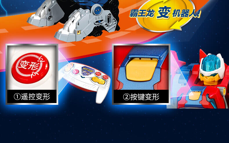 变形恐龙-守护者至尊霸王龙.一键遥控变形,仿真踏步机器人!炫酷一键变形,霸王龙变机器人,高大威猛巨无霸机器人身高36厘米,高大威猛,让孩子爱不释手,霸王龙身高30厘米,身长38.7厘米,外形威武,霸气夺人眼球.空旷地方可达80米超远遥控距离,让小朋友可以随心所欲遥控机器人,操纵恐龙.机器人关节灵活,双臂可前后摆动张开,膝关节可自由弯曲,伴随动感音效威猛向前行走。机器人形态下,按特技键,机器人将向前冲刺约两米;恐龙形态下,按特技键恐龙可以180度左右旋转怒吼,进入作战状态。逼真的恐龙怒吼和炫酷的机械感音效,带孩子感受远古巨兽与机器人的魅力。