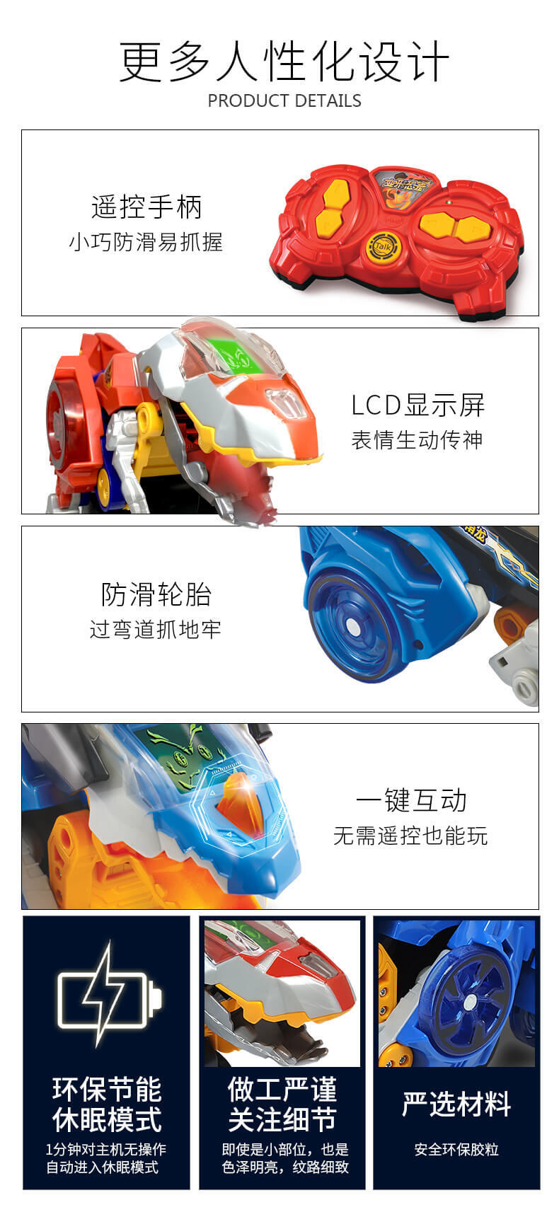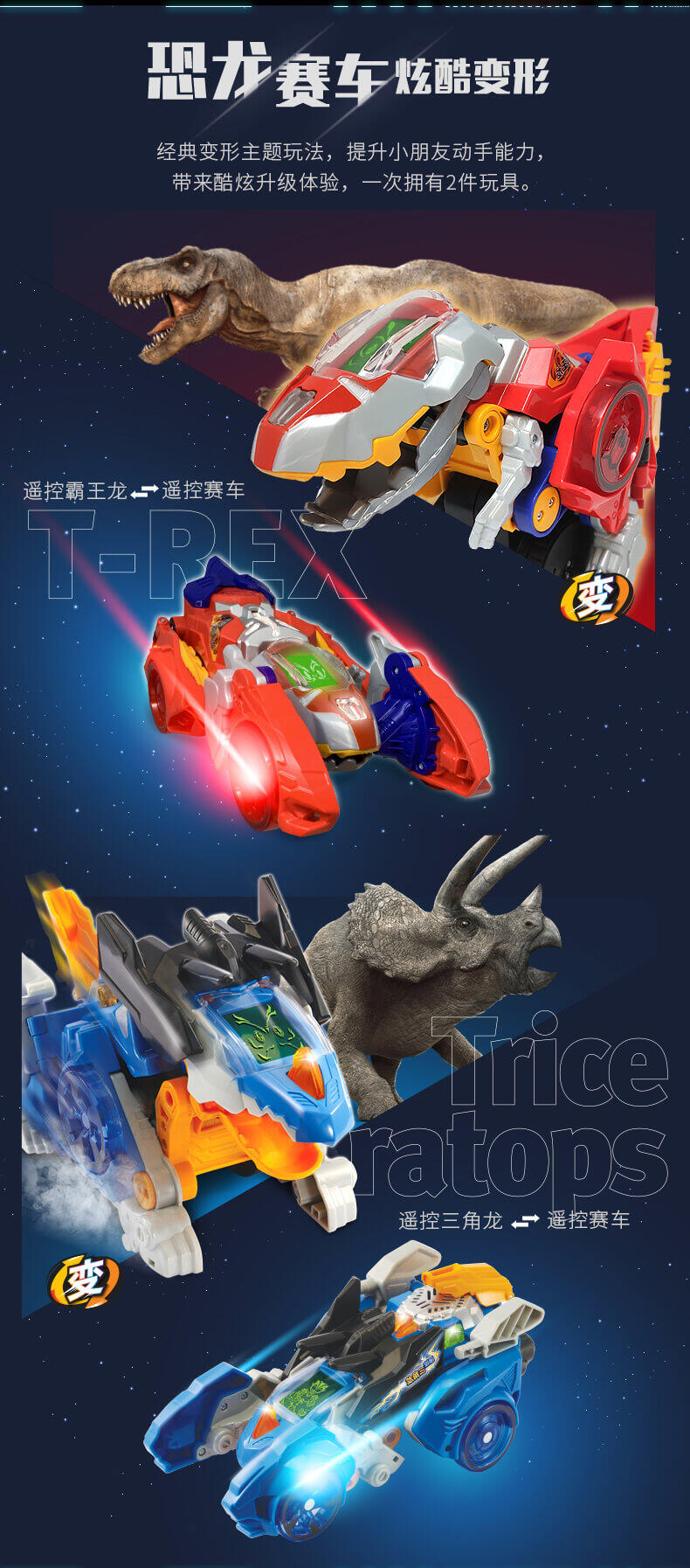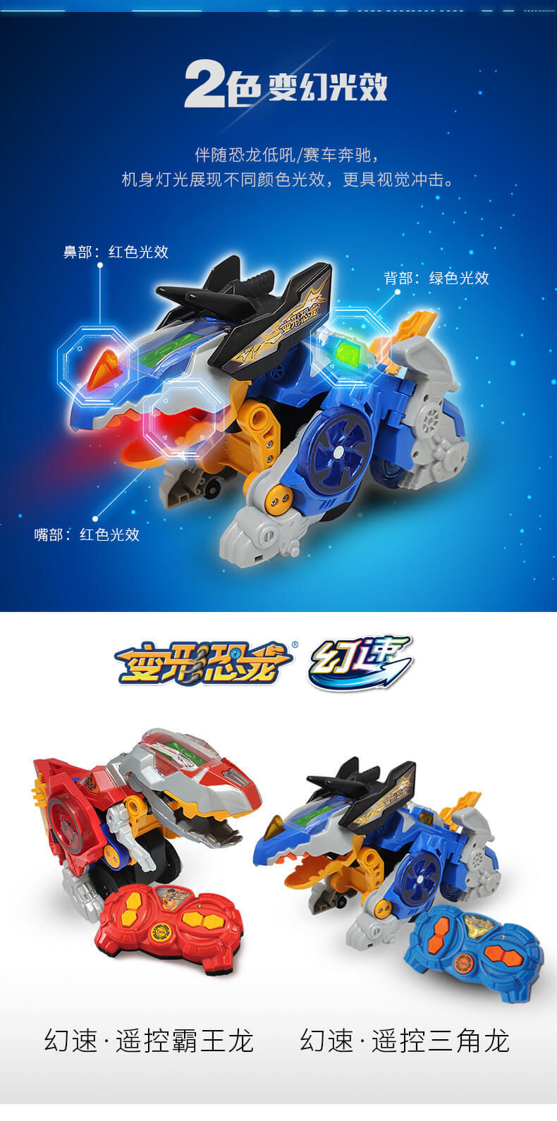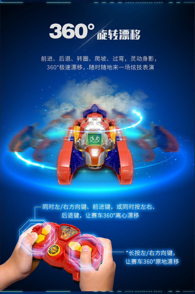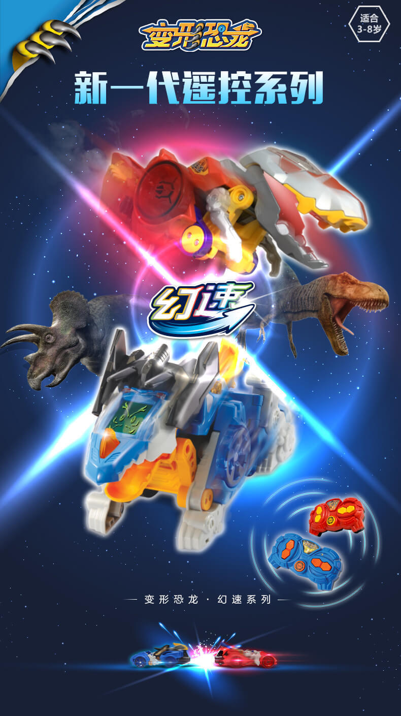 变形恐龙——幻速系列拥有四大核心功能:漂移,竞速,变形,遥控,一款玩具,满足孩子对“遥控玩具”和“变形恐龙玩具”的两种需求。