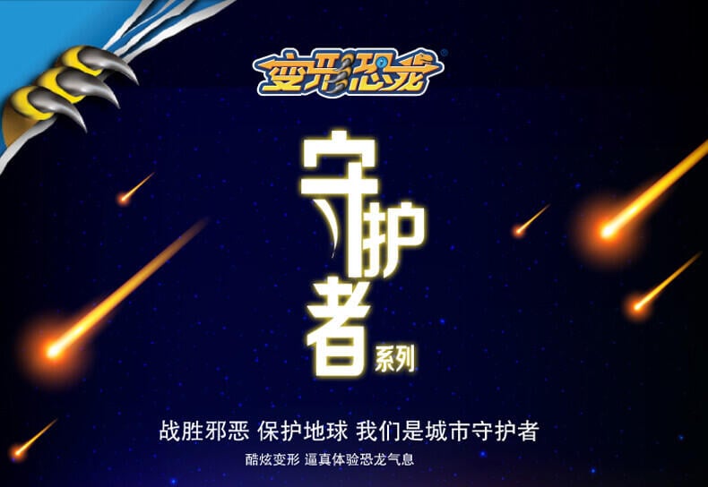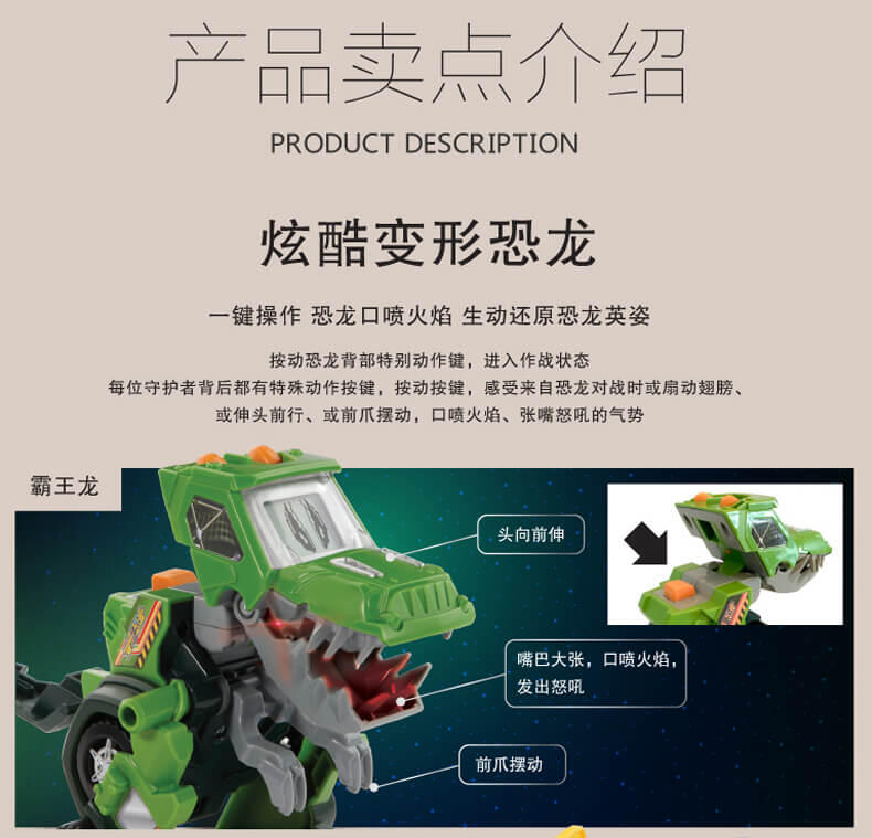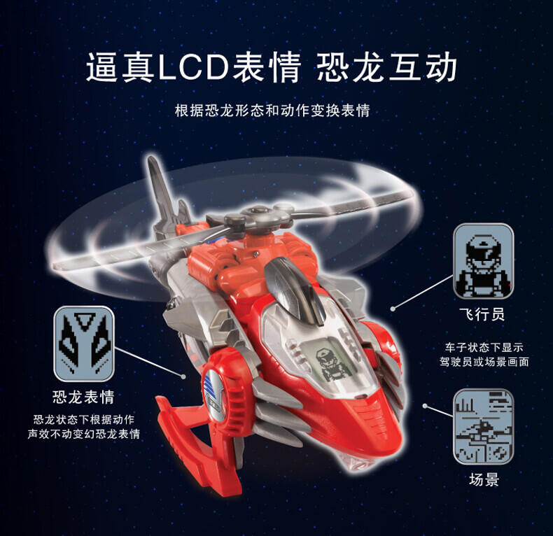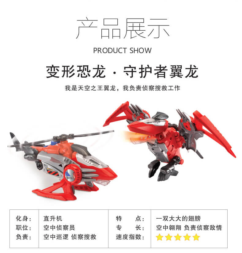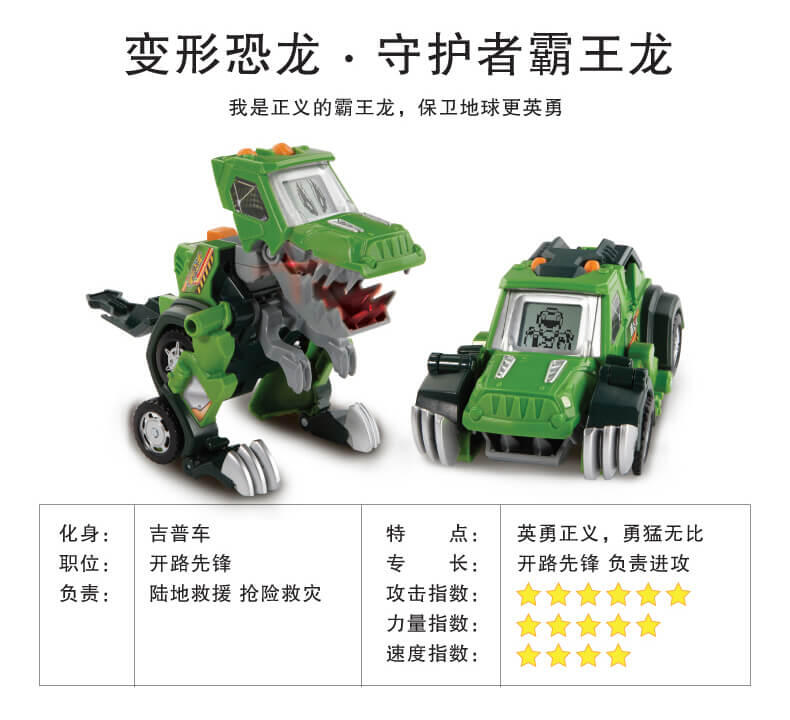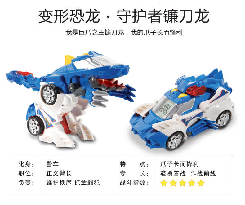 变形恐龙-守护者· 镰刀龙,酷炫变形恐龙; 逼真LCD表情;霸气恐龙动作;丰富互动语音;趣味动感音乐;变身城市救援工具车;内置震动感应