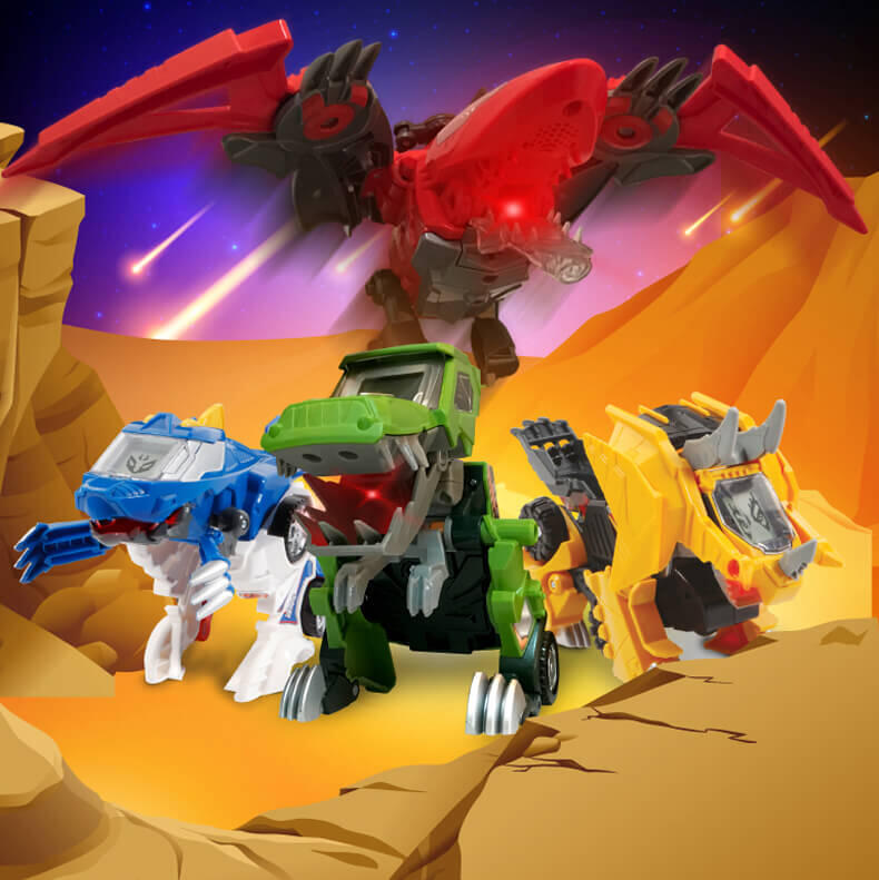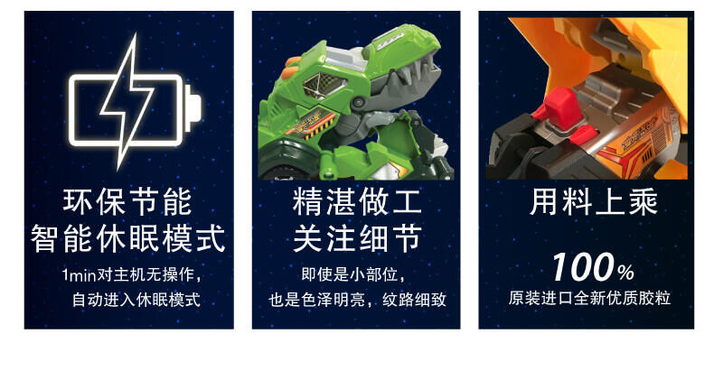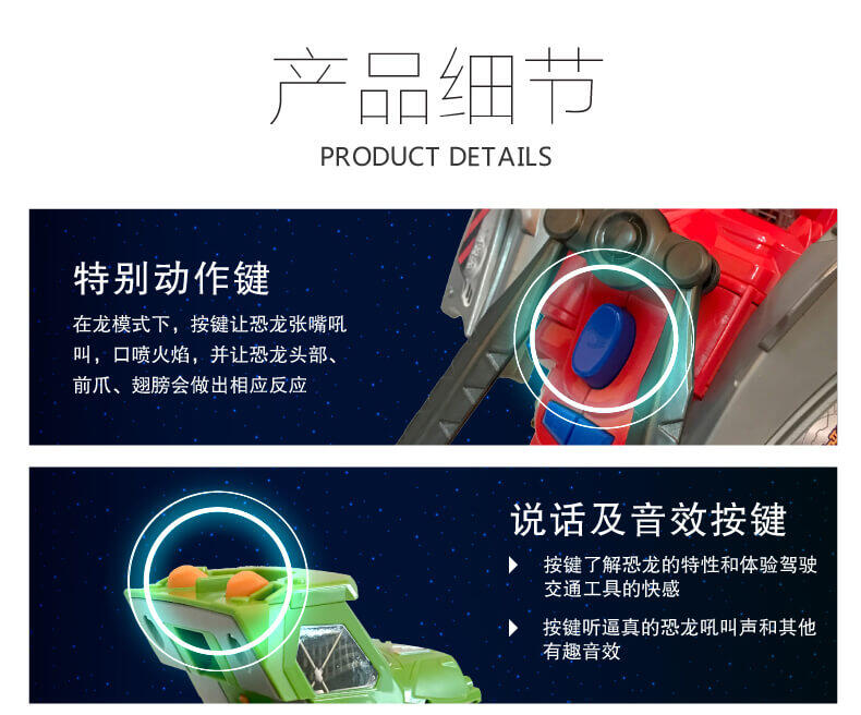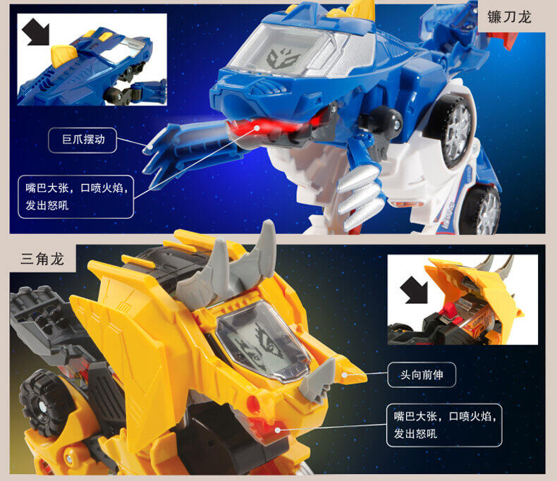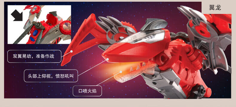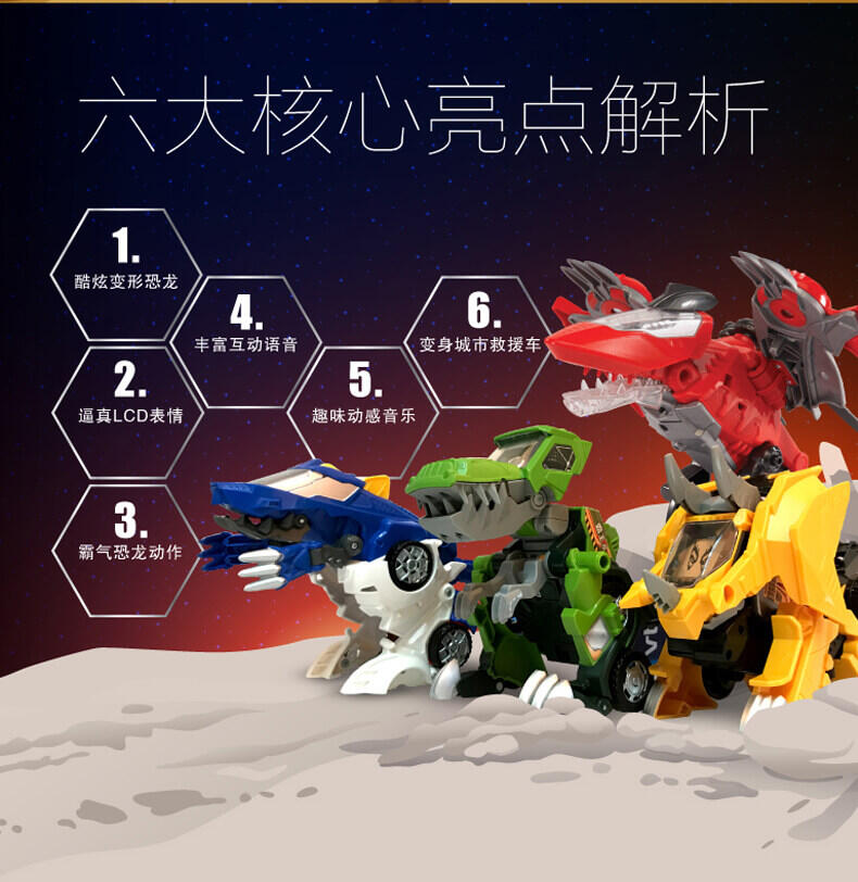 变形恐龙-守护者· 镰刀龙,酷炫变形恐龙; 逼真LCD表情;霸气恐龙动作;丰富互动语音;趣味动感音乐;变身城市救援工具车;内置震动感应
