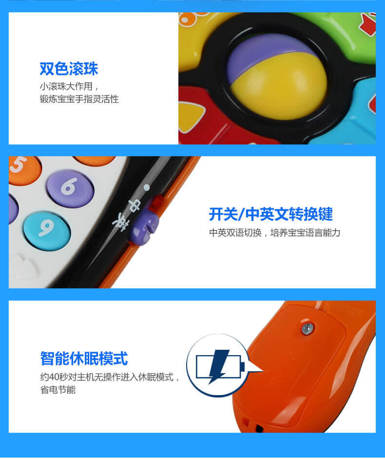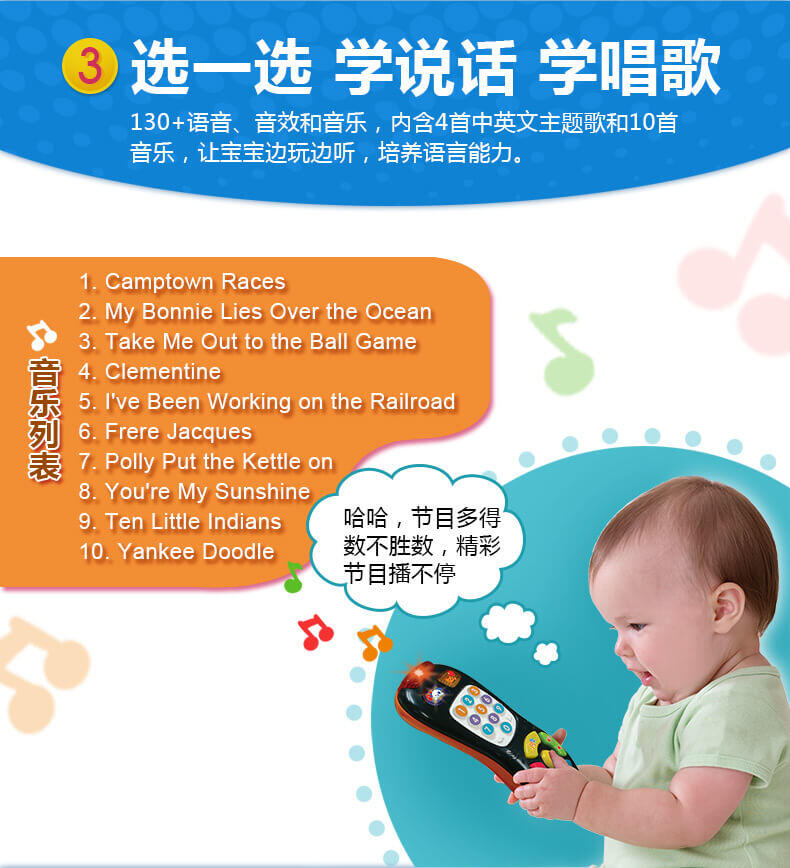 130多种语音/音效/音乐,内含4首中英文主题歌和10首音乐,让宝宝边玩边听,培养语言能力。