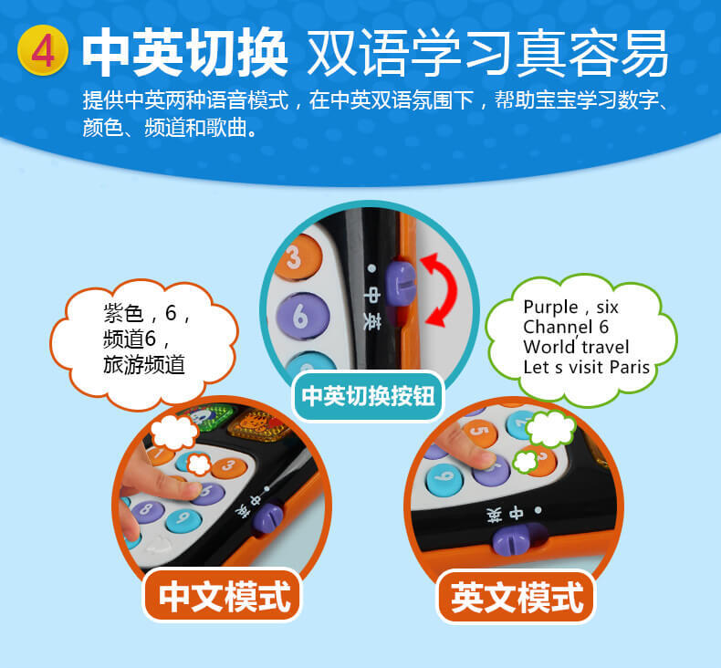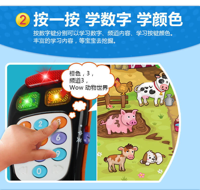9大节目频道,精彩节目内容。按数字键分别可以学习数字,频道内容,学习按键颜色。丰富的学习内容,等待宝宝去挖掘。