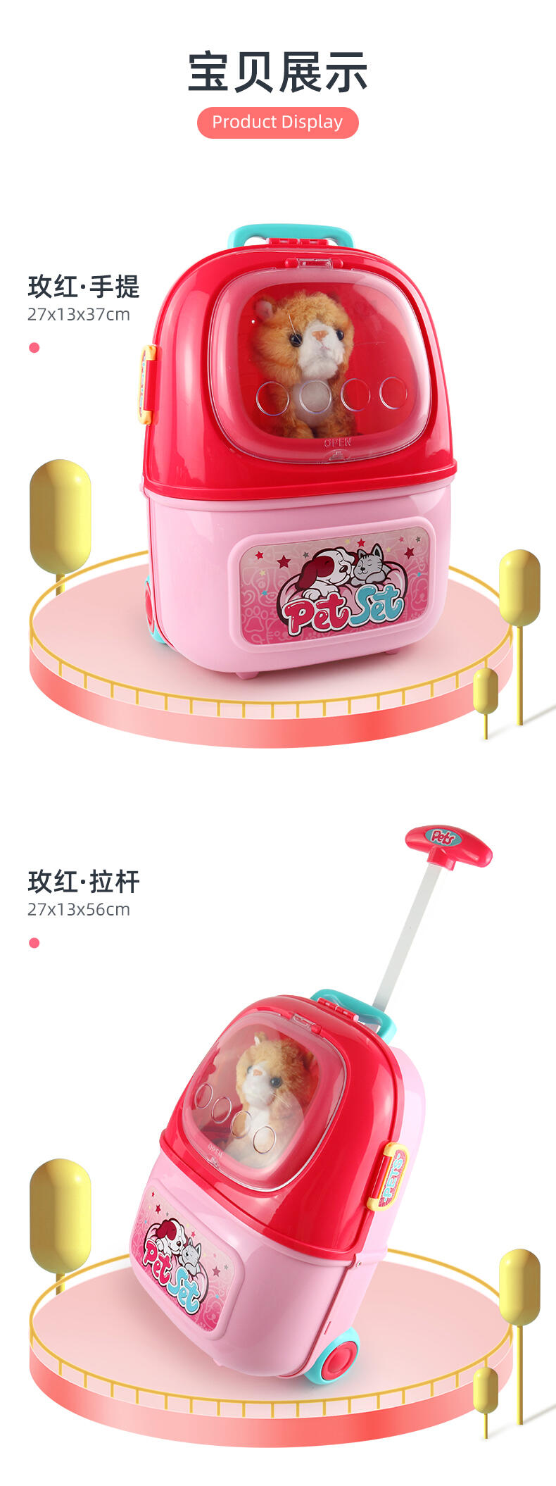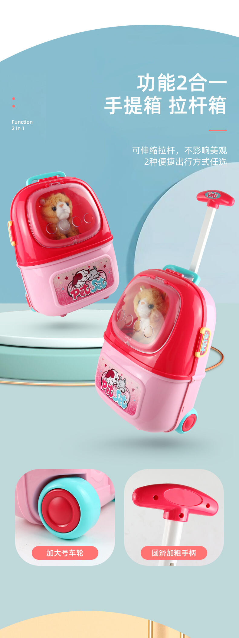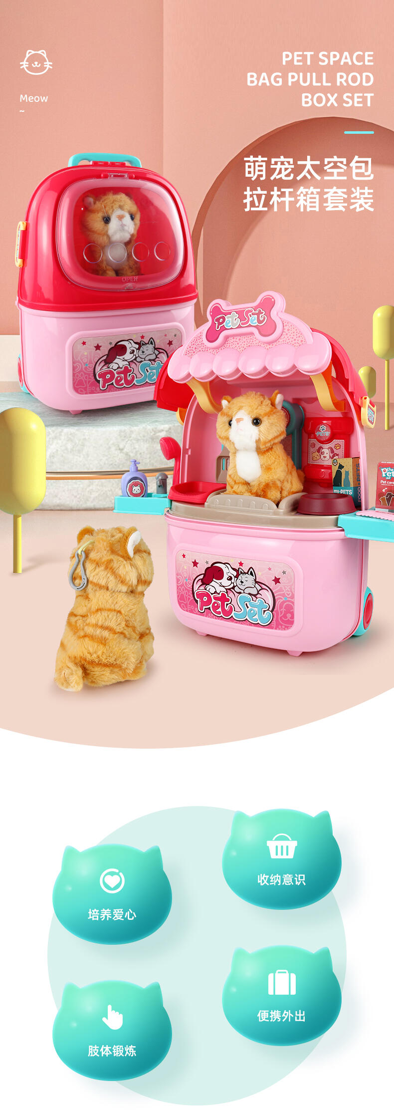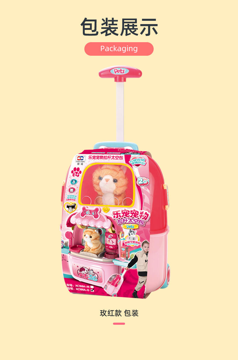 乐宠宠物拉杆太空包产品设计新颖可简易切换为宠物护理台或拉杆箱,配备造型可爱的毛质柔软的毛绒猫咪,还有丰富多样的宠物用品道具配件,宝宝通过产品结合已有的生活经验开展呵护宠物的过家家游戏,给猫咪洗澡、梳理毛发、与小伙伴们一起玩耍,培养宝宝的动手能力及语言社交能力。