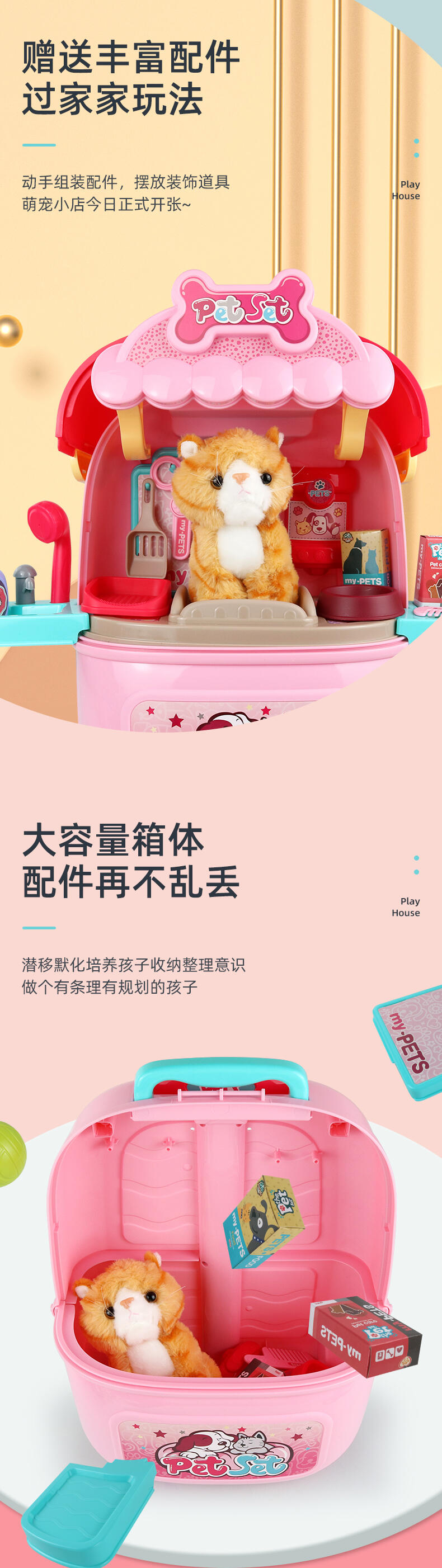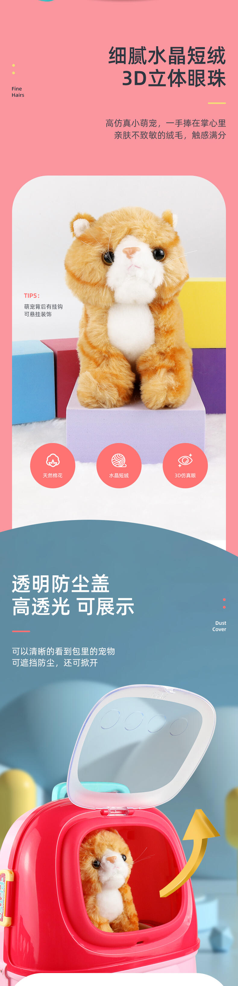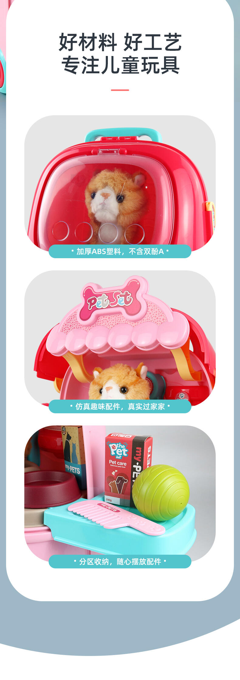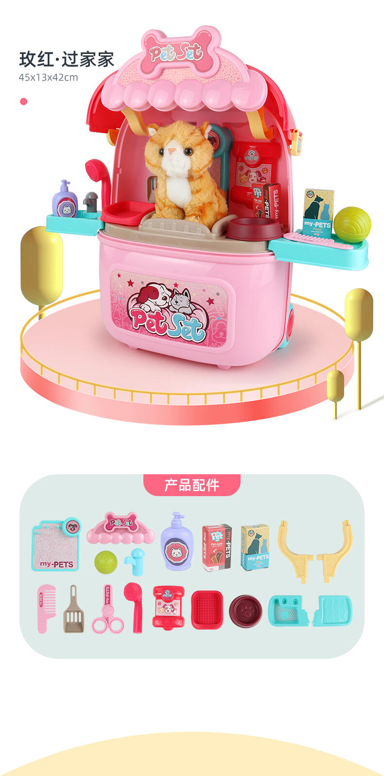 乐宠宠物拉杆太空包产品设计新颖可简易切换为宠物护理台或拉杆箱,配备造型可爱的毛质柔软的毛绒猫咪,还有丰富多样的宠物用品道具配件,宝宝通过产品结合已有的生活经验开展呵护宠物的过家家游戏,给猫咪洗澡、梳理毛发、与小伙伴们一起玩耍,培养宝宝的动手能力及语言社交能力。