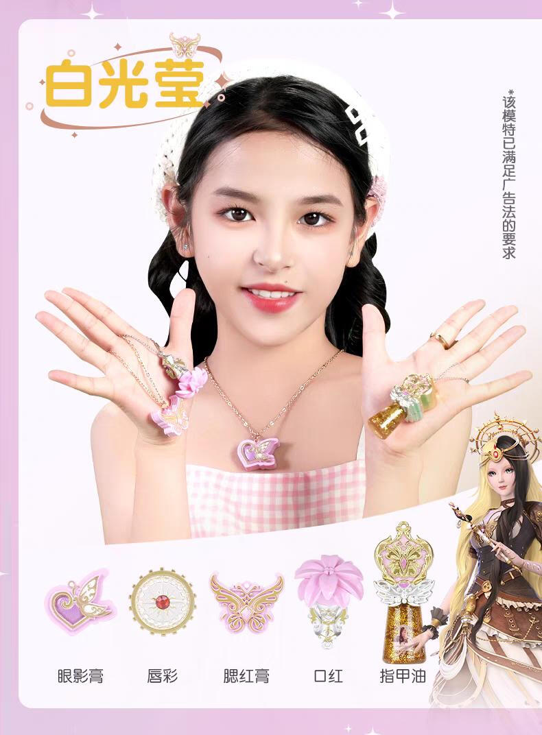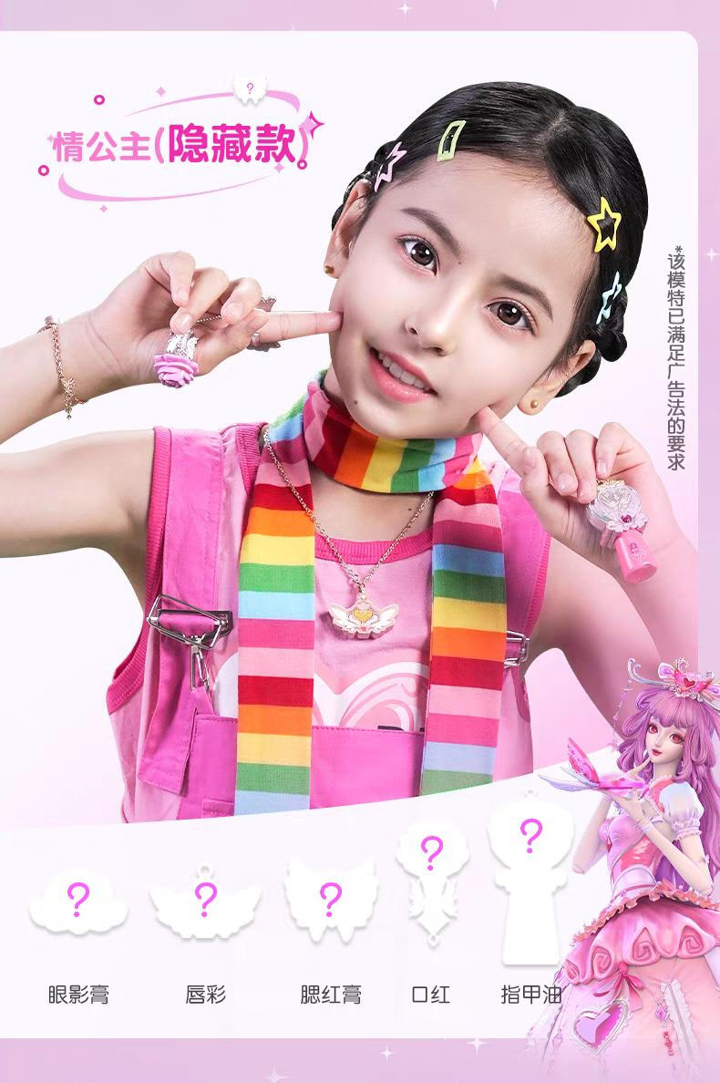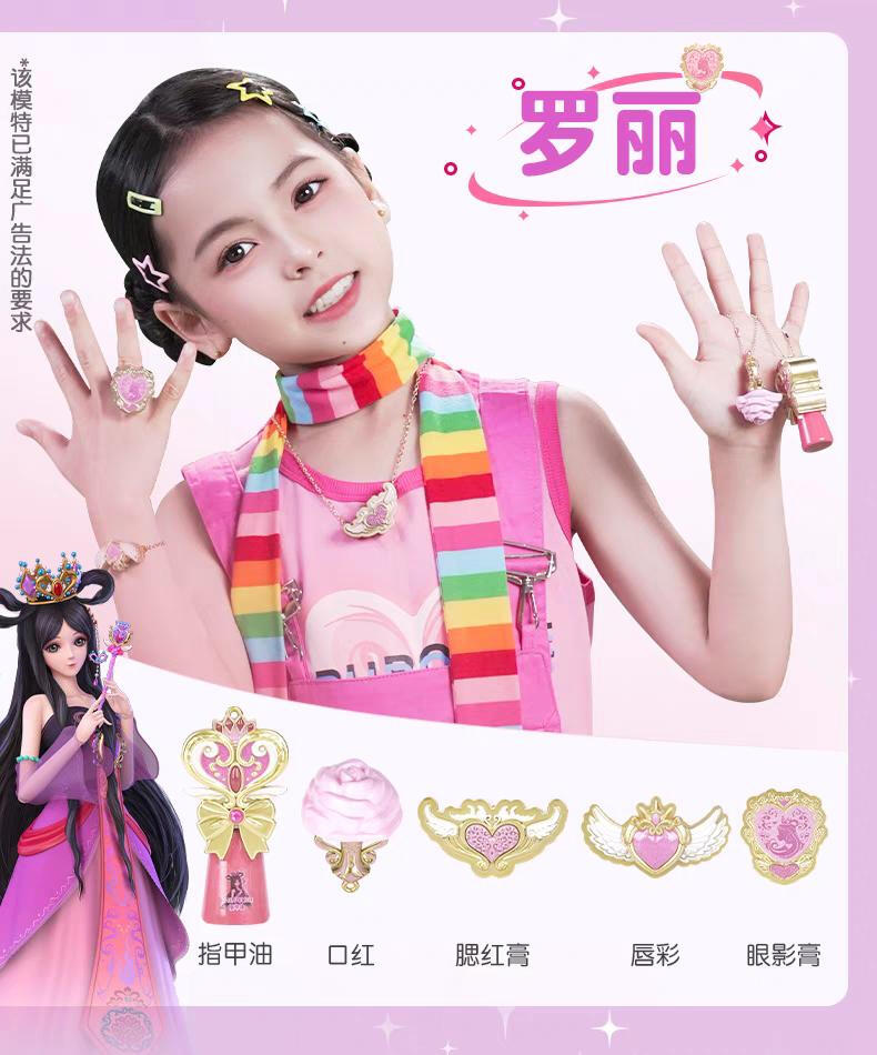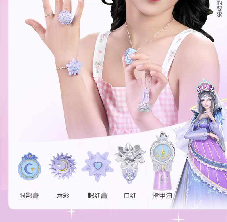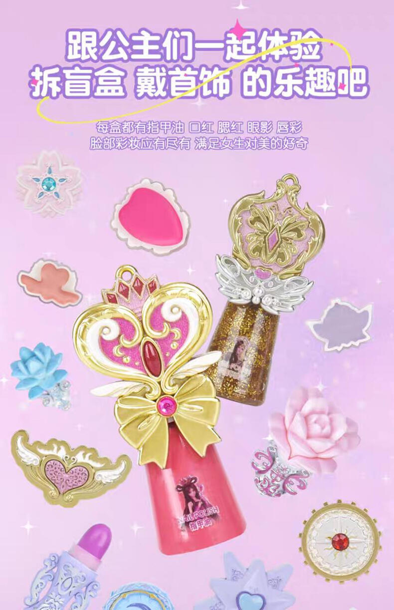 1色唇膏,1色指甲油,1色唇彩,1色眼影膏,1色腮红膏,1个戒指环,1条项链,1条手链,1张说明书,1张贴纸,