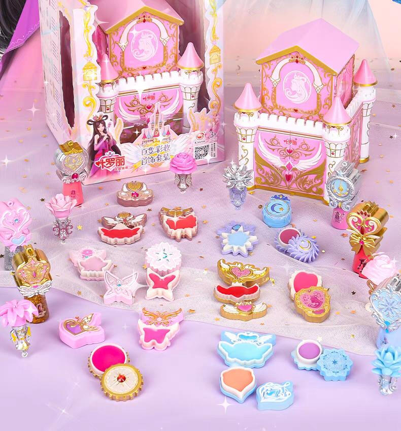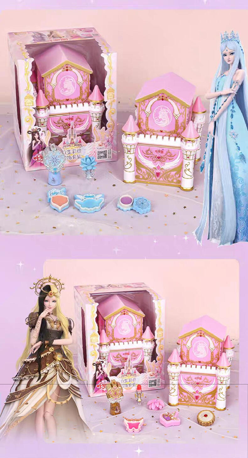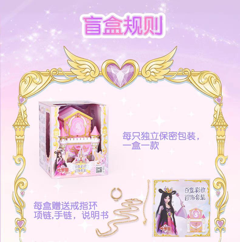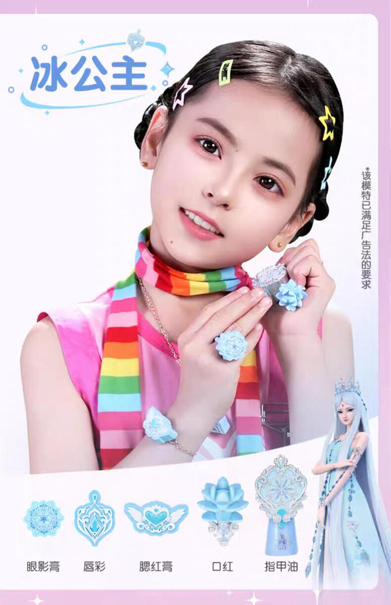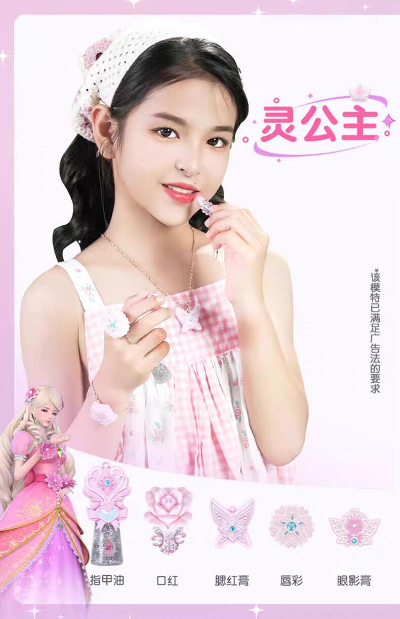 1色唇膏,1色指甲油,1色唇彩,1色眼影膏,1色腮红膏,1个戒指环,1条项链,1条手链,1张说明书,1张贴纸,