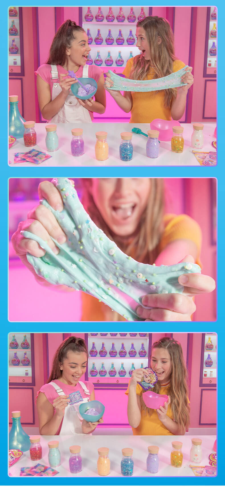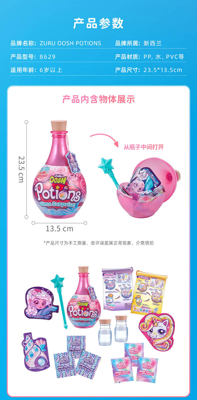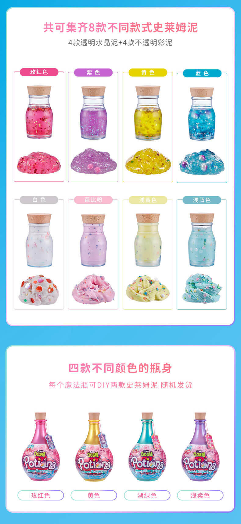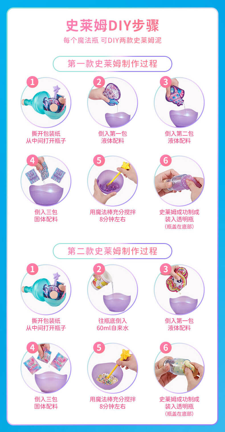 从火花到粘液,还有更多的发现!Zuru Oosh的《新药水史莱姆惊喜》为DIY粘液制作增添了一点魔力。 有4种不同的魔力药水瓶,每瓶内都有两个惊喜药水(单独出售),从BFF的Elixir药水到迷人的魔药,孩子们可以按照自己的魔力配方安排想像力。 只需弹出闪亮的药水瓶,然后将底座用作碗,即可在深色搅拌棒中制作出带有所含辉光的每种药水。 每个具有魔力的药水都有自己的粘稠粉或粉底,三个不同的配件,储物瓶和易于遵循的魔法配方。 让魔术开始吧!