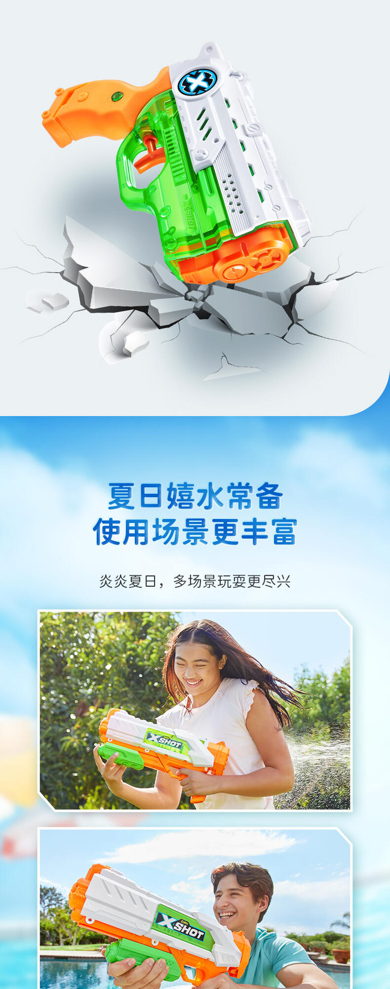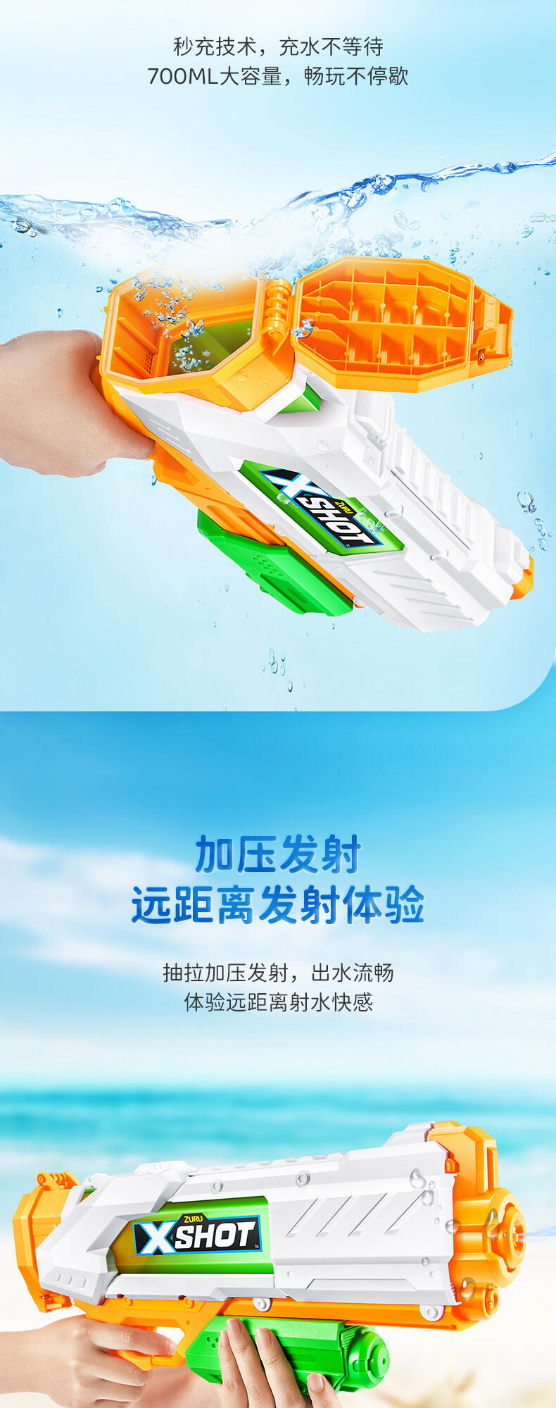 Zuru筑愉 X-Shot X 特攻巨浪吞食者速充水枪潜行者小款速充水枪套装,可让您在短短 1 秒内重新装满水。并早于您的小伙伴回到喷水动作中。只需打开水枪密封仓盖、装水并关闭水枪密封仓盖。不要让小款速充水枪的尺寸欺骗你!小巧而强大,其 100 毫升的水箱射程可达9 米。