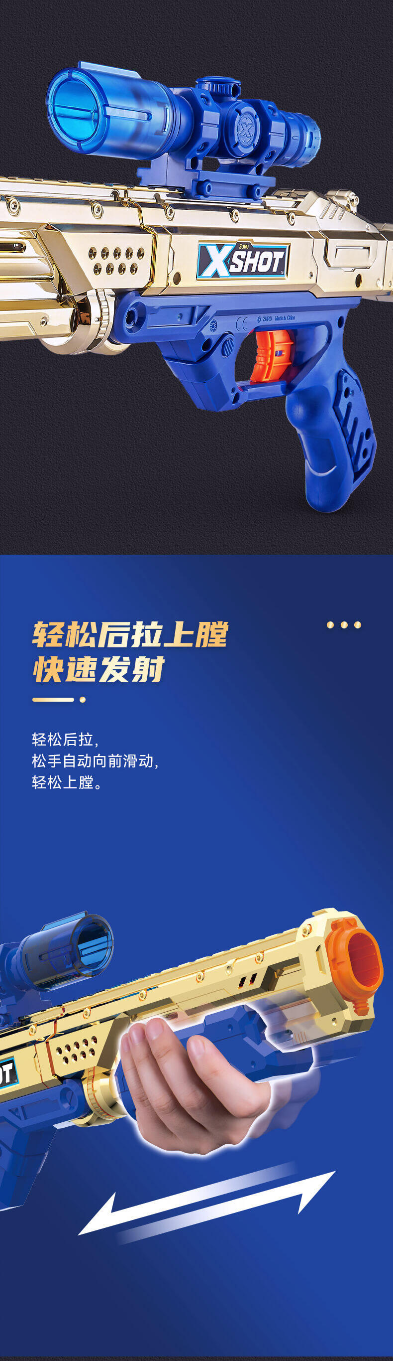 使用 X-Shot Hawk Eye Royale 版 Chrome Gold 爆破器锻炼精确视觉! 凭借其可拆卸的瞄准镜和泵动机构,X-Shot Hawk Eye 将爆破器提升到一个新的水平! 可存放 4 支飞镖,其战术手柄确保快速的飞镖射击击中任何移动的目标!