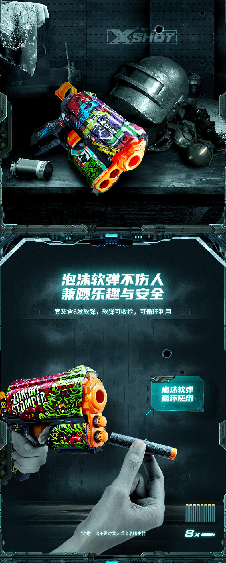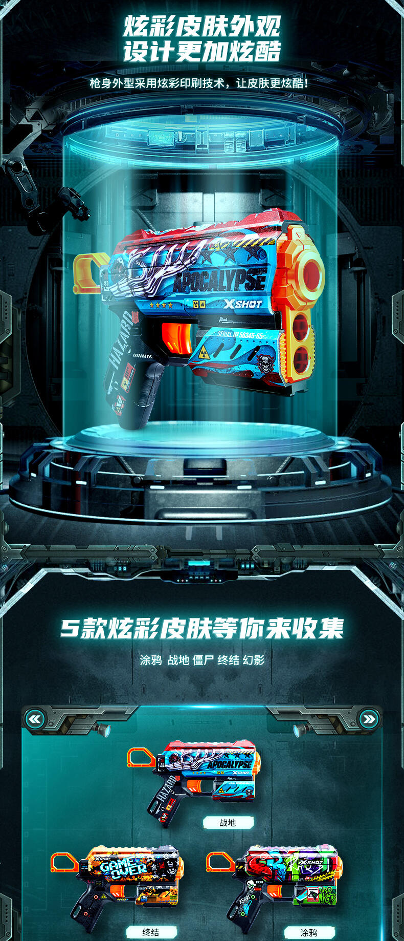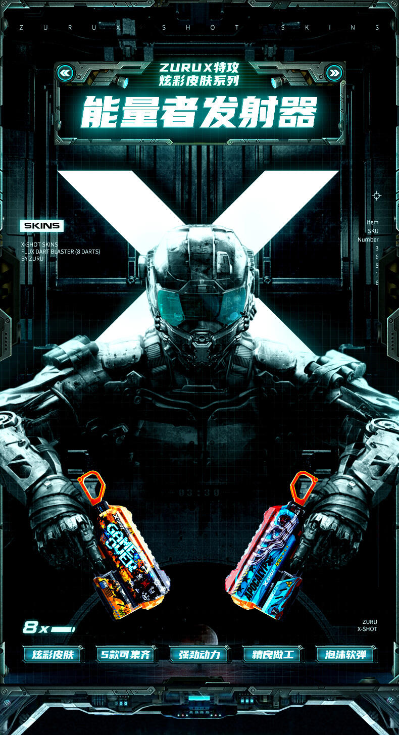 X-Shot 皮肤枪系列将游戏中的皮肤带入现实世界,选择你喜欢的皮肤颜色并加入战斗。使用X-SHOT X特攻炫彩皮肤系列能量者发射器直接进入游戏。凭借单个发射器和 2 个软弹存储位,让你更容易重新为发射器添加软弹,可以随时为战斗做好准备。它可以击中20米远的目标,并在每次射击后反冲以获得最大功率。让你有更好的游戏体验!X-Shot Skins发射器包括新的气囊技术,可实现更快,更远,更准确的射击。X-Shot皮肤通量冲击波有6种独特的皮肤可供选择和收集,快来建立你的终极军械库。